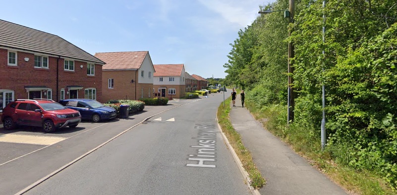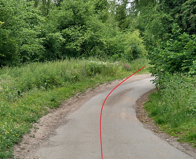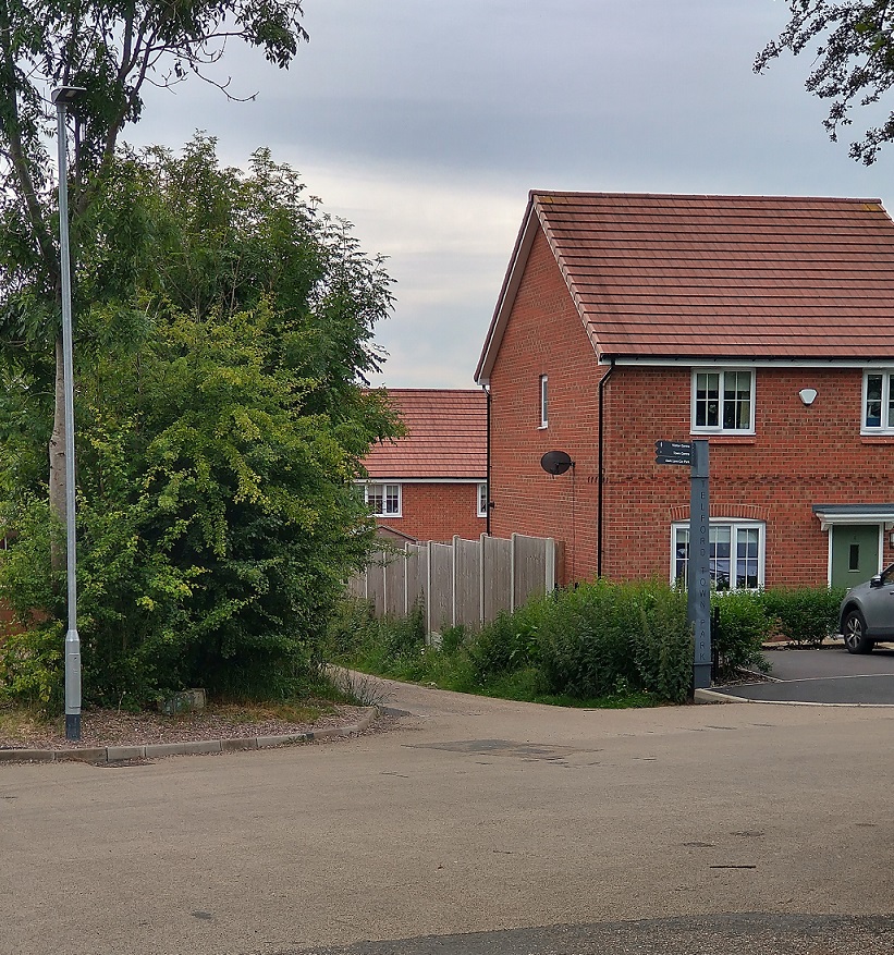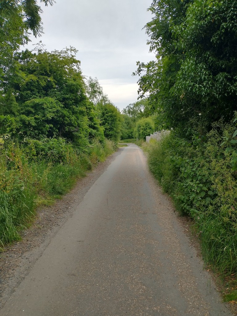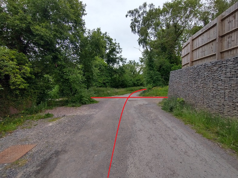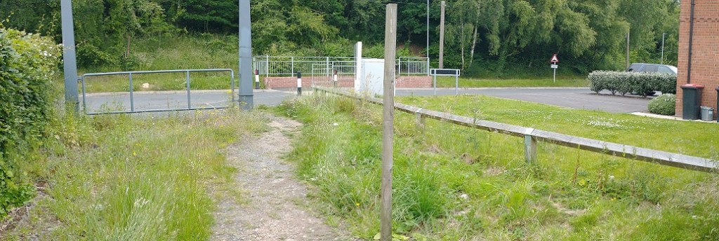 The junction of Hinkshay Road and the public road from Little Eyton. The now demolished White Hart In dominates the junction which was also a significant tramway junction. The line we have been following enters the extract from the top left and encounters a trailing connection with the lines serving Langleyfield Colliery. Two lines leave our tramway route at the road junction. One of these, runs Northeast towards what is now Telford Town Park. Another runs Southwest for a short distance. A passing loop can be seen on this line just before it exits the map extract. Our line continues in a Southeast direction. [6]Approximately the same area as in the map extract above but this time from April 2021 rather than the 19th centuryThe view across Hinkshay Road from the North. The ginnel ahead is the route of the tramway that we are following. Tramways branched right and left from this location along Hinkshay Road. [My photograph, 15th June 2022]Looking back across Hinkshay Road from the South. The footpath following the line of the old tramway is protected by metal gates. [My photograph, 15th June 2022]Looking along Hinkshay Road from the West across the location of the tramway junction. [My photograph, 15th June 2022]Looking West along Hinkshay Road. One of the tramway branches ran on the North (left) side of the road for a short distance. [My photograph, 15th June 2022]Looking West a little further along Hinkshay Road. The tramway once ran directly in front of these cottages before running off to the left. [My photograph, 15th June 2022]On the 6″ OS Maps the tramway can be seen curving away to the North of Hinkshay Road at this point. It seems to terminate in the vicinity of a church but probably served the collieries which stood on the North side of Hinkshay Road at this point. [My photograph, 15th June 2022]