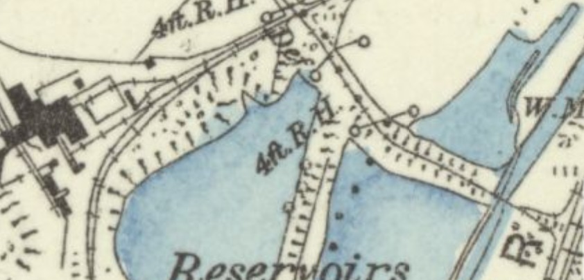 We continue heading Southeast from the tramway ‘crossroad’ in the 6″ extract following the line between the Hinkshay Pools.
