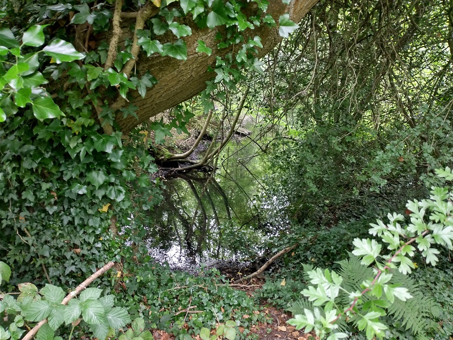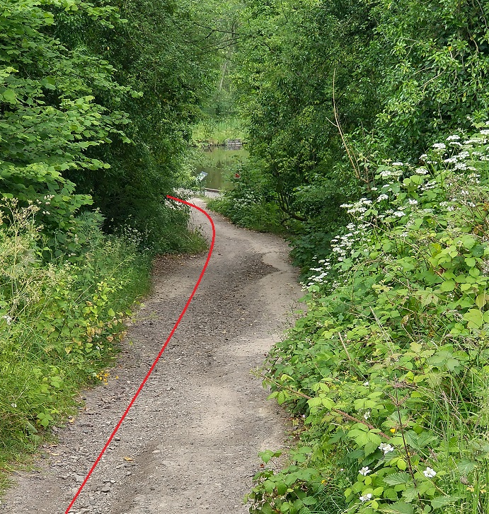The access road swings to the right to enter the car park. The tramway ran ahead probably just to the left of the road as it disappears around the vegetation. [My photograph, 15th June 2022]Looking North from the Southern edge of the car park at Hinkshay Pools. The approximate line of the tramway is marked by the red line on the right side of the image. [My photograph, 15th June 2022]In this image we are facing Southeast at the same location as the image immediately above. The tramway followed the unsurfaced path round to the left. One of the Hinkshay pools is visible on the right of the image. [My photograph, 15th June 2022]The display board at Hinkshay Pools. [My photograph, 15th June 2022]The reference on the top right of the display board to the Coalport Branch of the Shropshire Canal is important as the canal ran along the East side of the Pools. [My photograph, 15th June 2022]One of the Hinkshay Pools. [My photograph, 15th June 2022]A remnant of the Coalport Branch of the Shropshire Canal. [My photograph, 15th June 2022]The tramway was carried over the line of the canal on an arched culvert which at least permitted ongoing drainage. Originally wharves would have existed along the side of the canal but once the railway was built the canal and its wharves would no longer have been required. [My photograph, 15th June 2022]This is the location of the Hinkshay Pools as drawn on a map of tramways taken from research undertaken by R.F. Savage & L.D.W. Smith and kindly made available by the Ironbridge Gorge Museum Trust Archive Office. It suggests that there was an additional tramway branch which ran out between two of the Pools. [9: p164] Savage and Smith say that the Lawleyfield Colliery had a wharf at this location in the early 1800s and that the lower pool was originally a canal wharf. [9: p166]Looking South-southwest along the line of the Canal. [My photograph, 15th June 2022]The remnant of the Canal on the North-northeast side of the tramway/footpath. [My photograph, 15th June 2022]