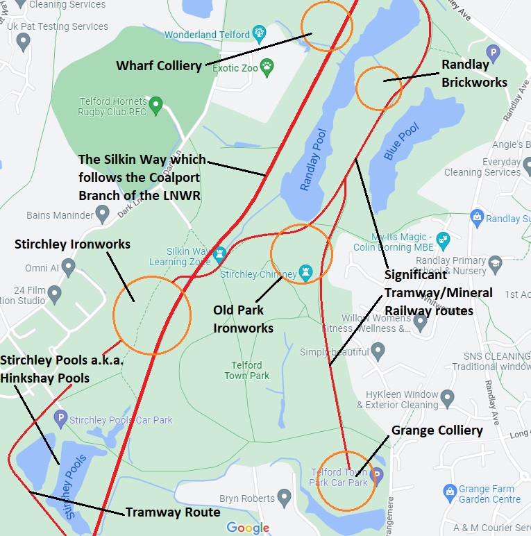 The history of the tramways and railways is relatively complicated. Tramways, predated the standard-gauge railway but in this area, rather then just becoming feeders to the railway network, a number were converted into standard-gauge Mineral Railways which could remain in private hands or, as in the case of the tramway/railway route to the West of the Coalport Branch and running to the West of Randlay Pool, they were taken over by the larger rail companies and in some cases, therefore became a part of British Rail!