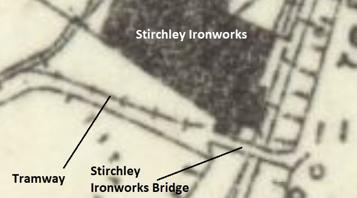 The next map below shows the continuation of the tramway as it crosses the tramway route covered in my earlier post [1] and then heads towards Stirchley Ironworks.