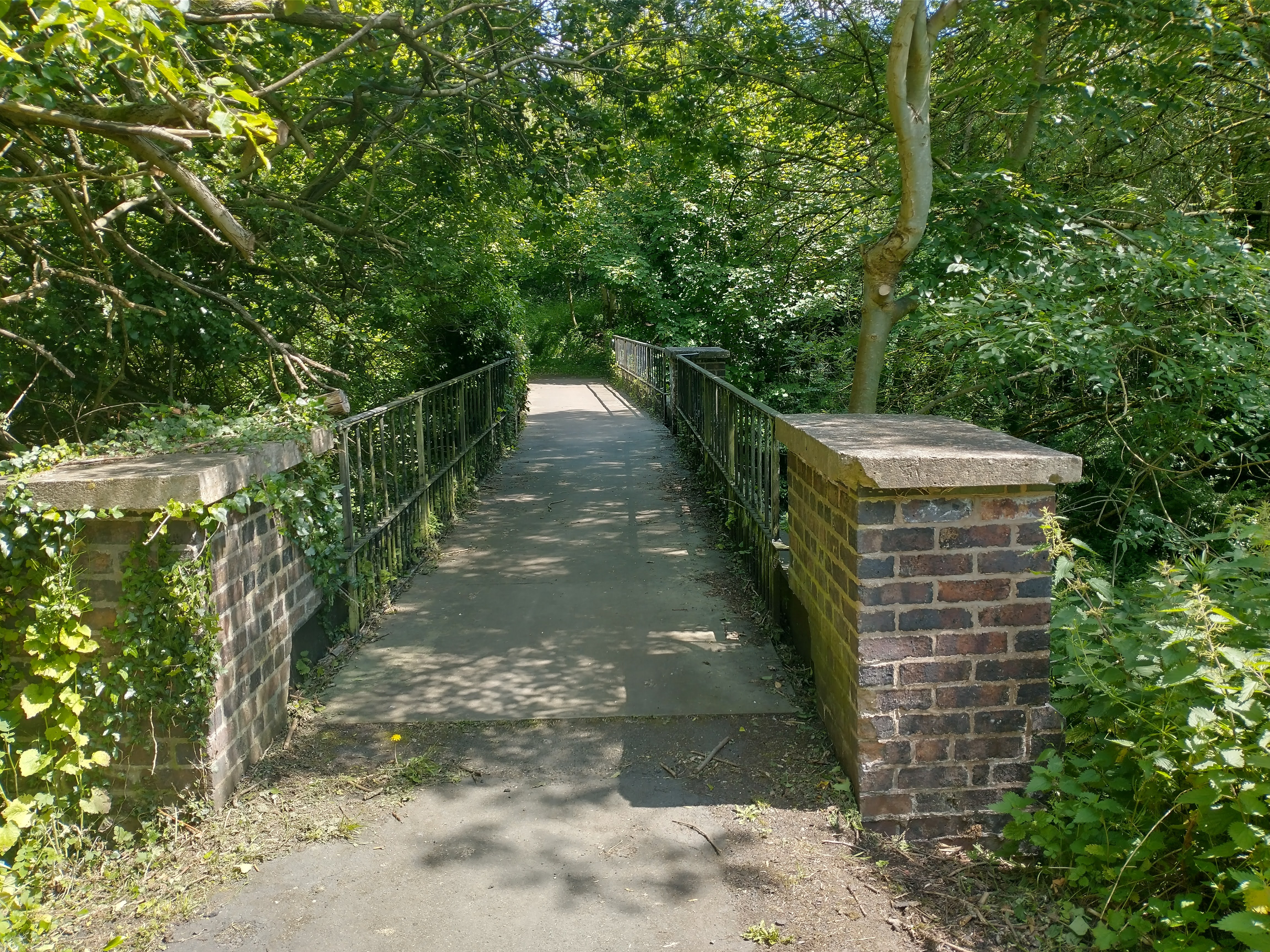 Using the maps and satellite images provided by the National Library of Scotlad it is possible to identify the location of the old bridge over the Canal/Railway but all that can be seen from the Silkin Way is thick undergrowth. I was unable to find any remnants of the old structure.
