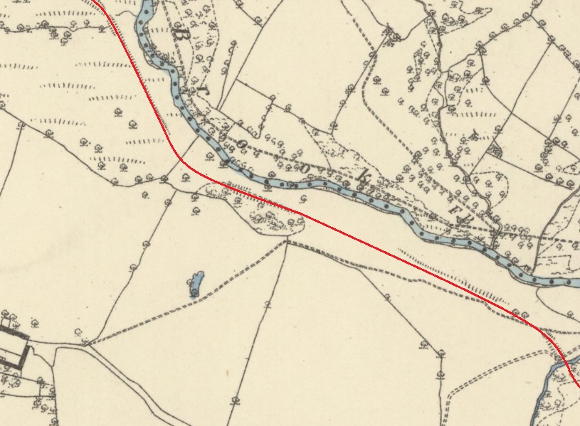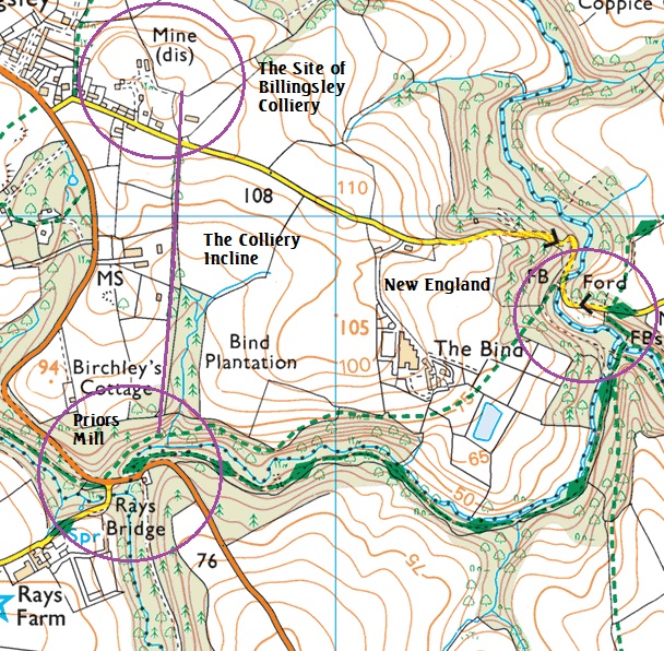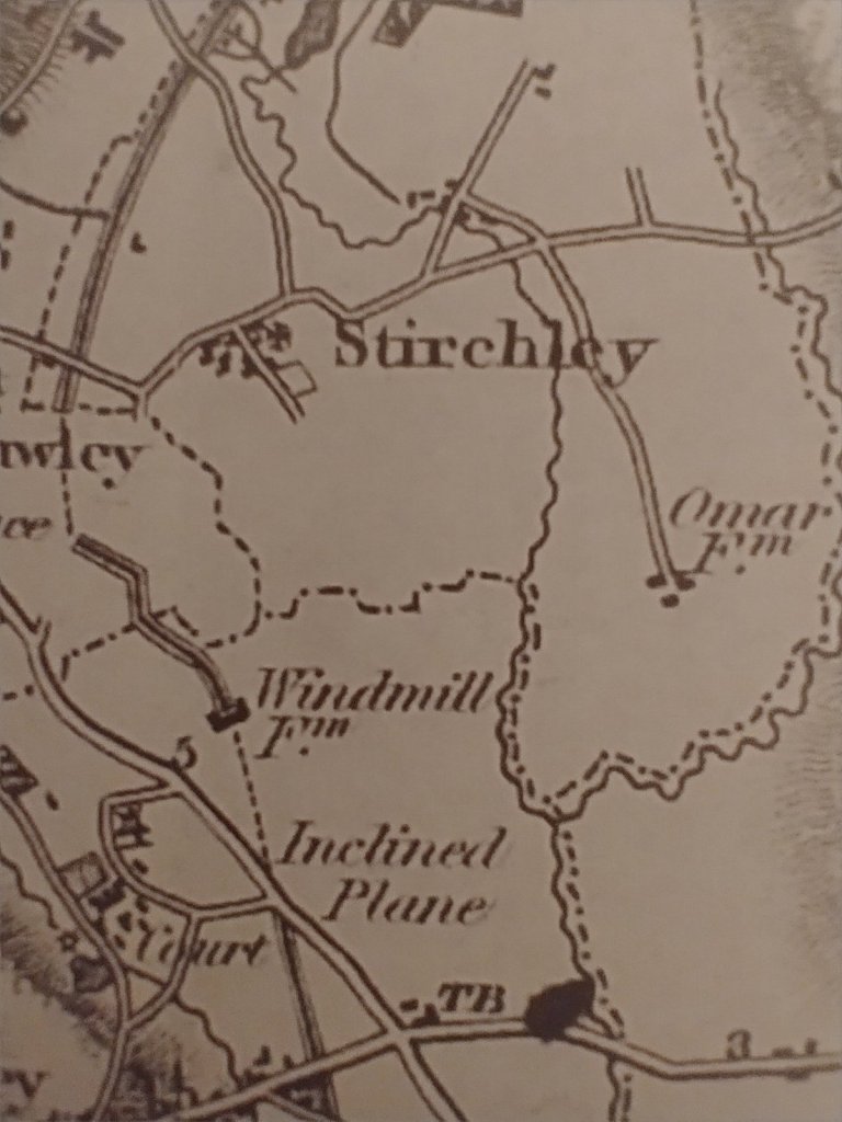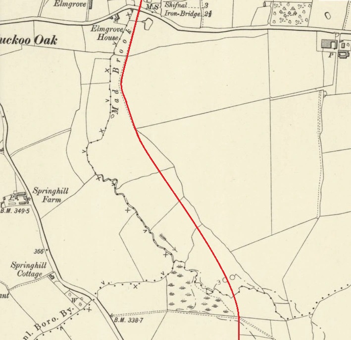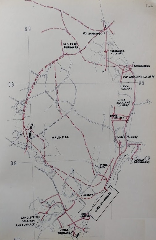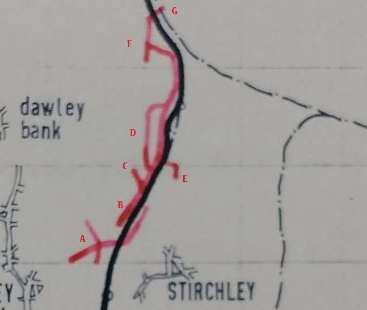The next length of the old tramroad brings us passed the site of Grange Farm and Grange Colliery, Stirchley Ironworks and close to Randlay Pool. Mad Brook meanders North, initially close to the line of the old tramroad, moving away West beyond Grange Farm and then getting lost in the midst of Stirchley/Oldpark Ironworks.