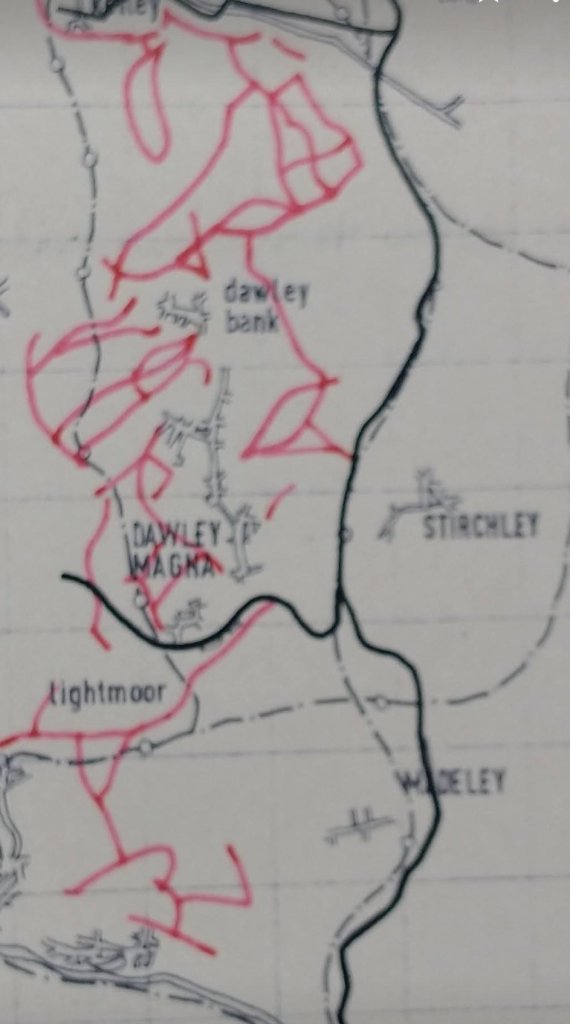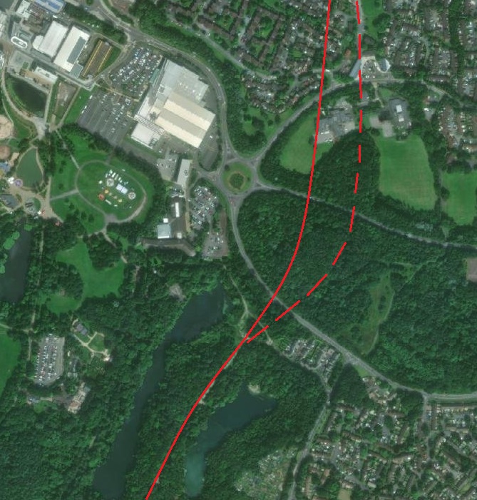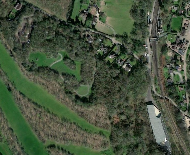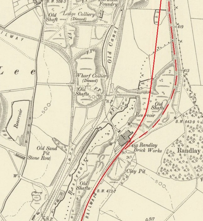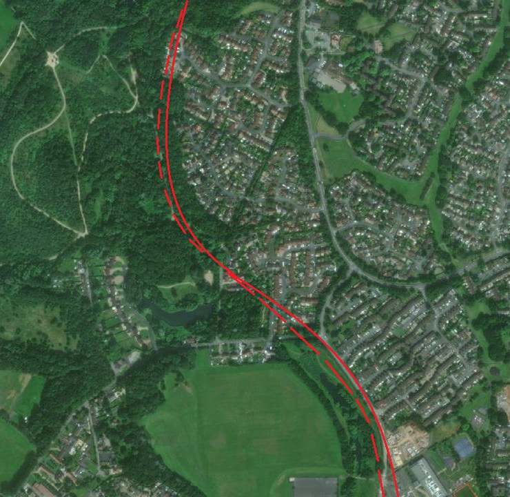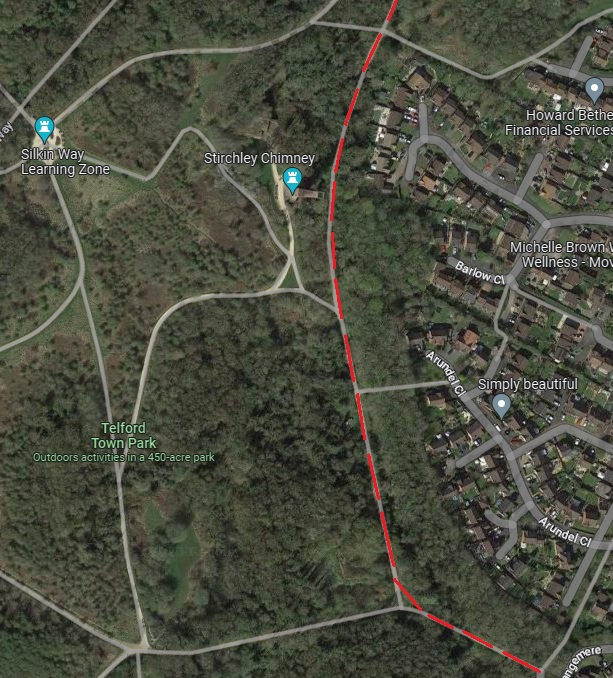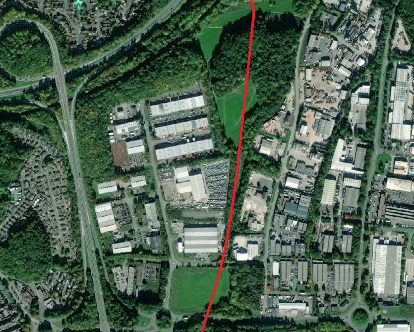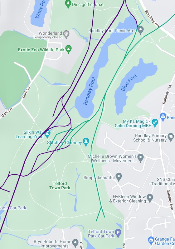 North of Randlay Pool the line of the old tramroad and the line of the GWR Mineral railway plunge into undergrowth and the topography of the area beyond this point for some distance is very unlikely to be the same as that present in 1901. In the top half of the satellite image above the lines crossed three modern roads, Stirchley Avenue, Queen Elizabeth Avenue and Dale Acre Way, then run geographically along the line of Downemead for a short way.