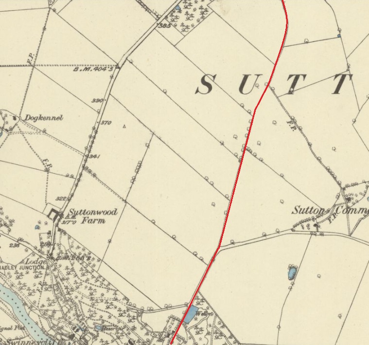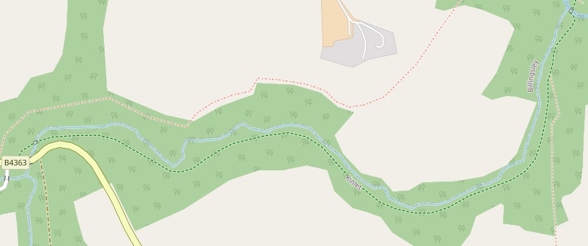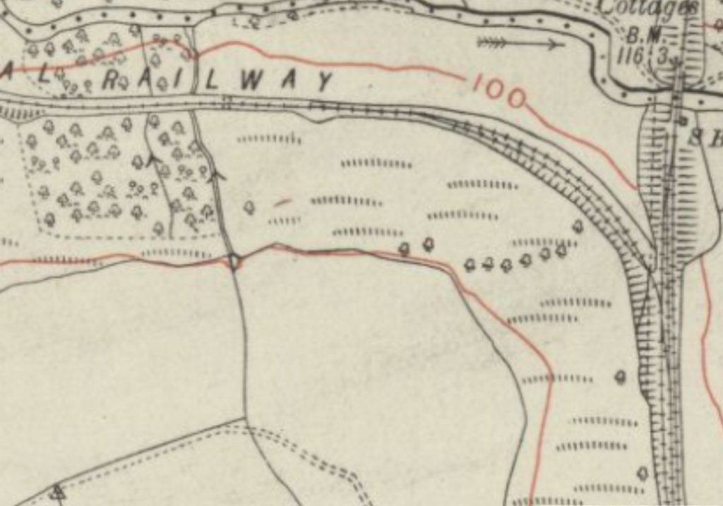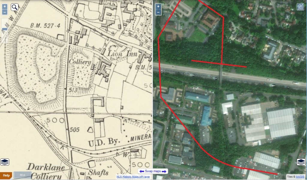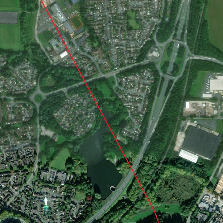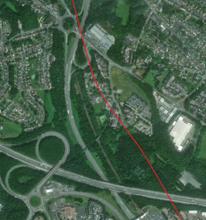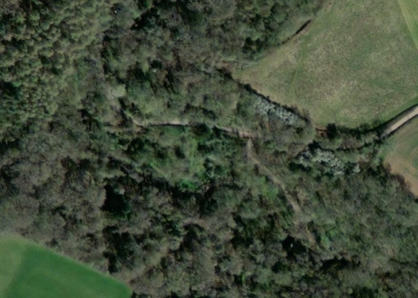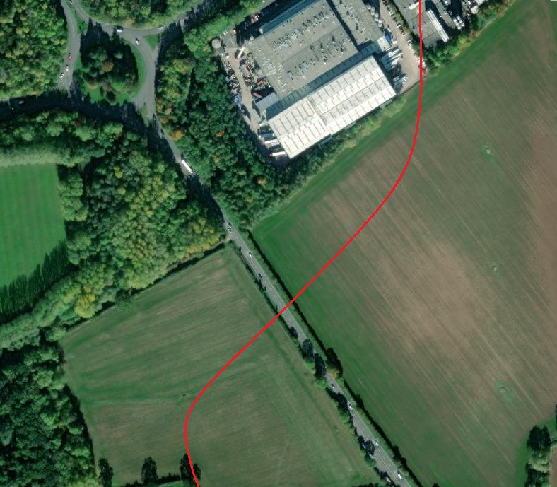 North of Randlay Pool the line of the old tramroad and the line of the GWR Mineral railway plunge into undergrowth and the topography of the area beyond this point for some distance is very unlikely to be the same as that present in 1901. In the top half of the satellite image above the lines crossed three modern roads, Stirchley Avenue, Queen Elizabeth Avenue and Dale Acre Way, then run geographically along the line of Downemead for a short way.