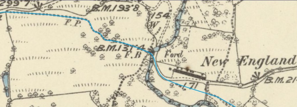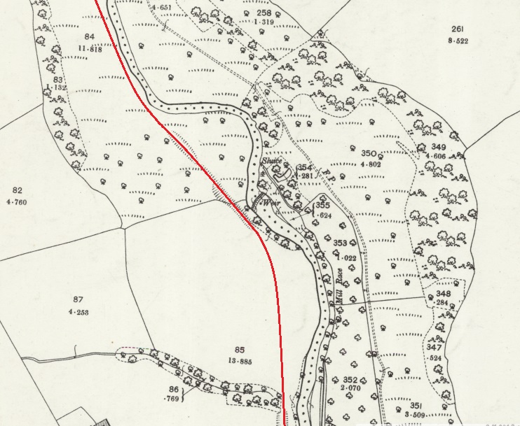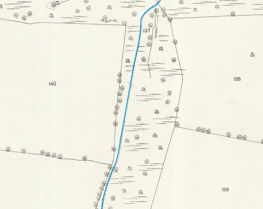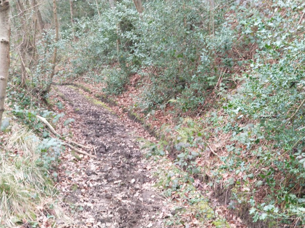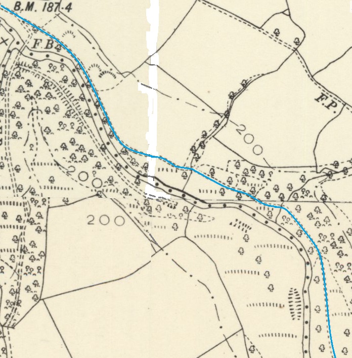 The next opportunity to look at the line of the tramroad comes at the point where its route is joined by a footpath which appears on the 1882 Ordnance Survey above and still is in existence today. The route appears on the modern 1:25,000 Ordnance Survey Explorer Series mapping as shown below.