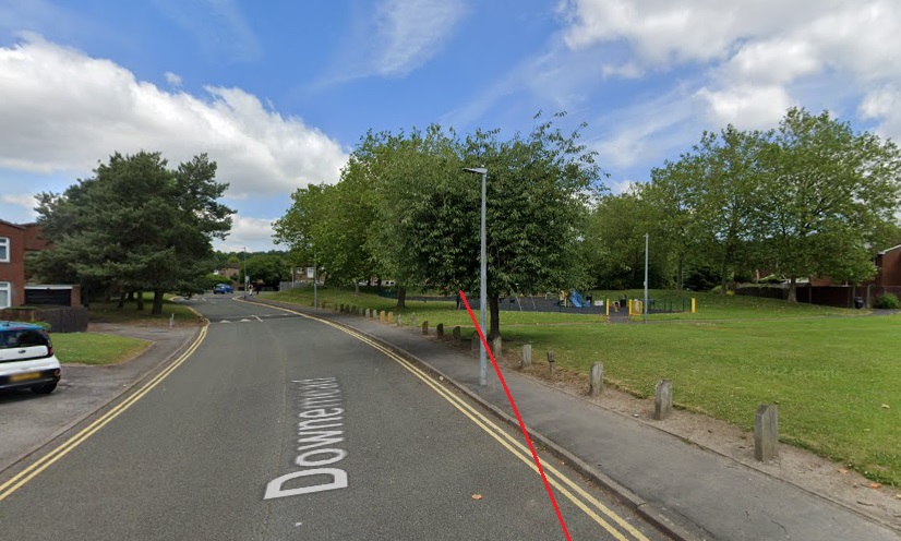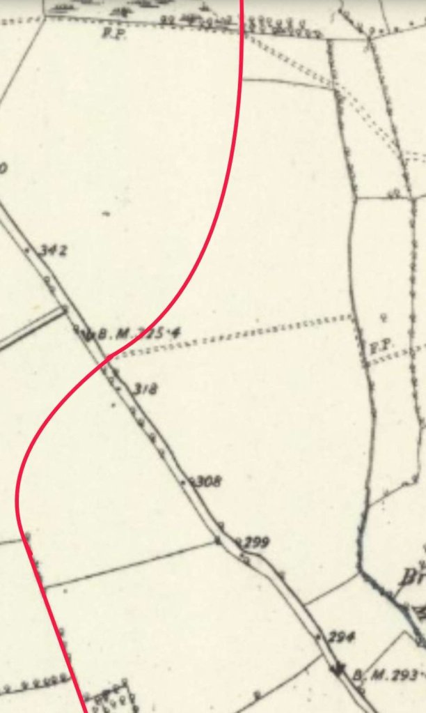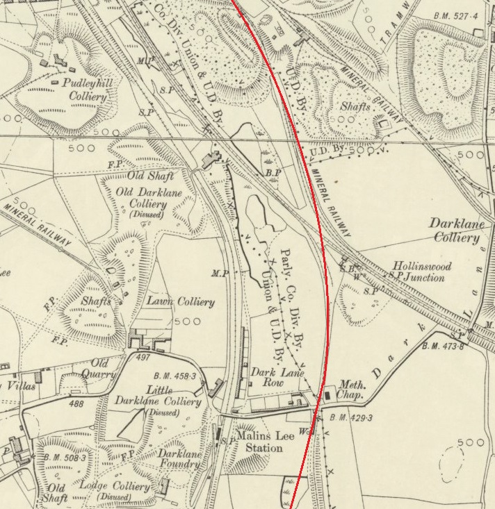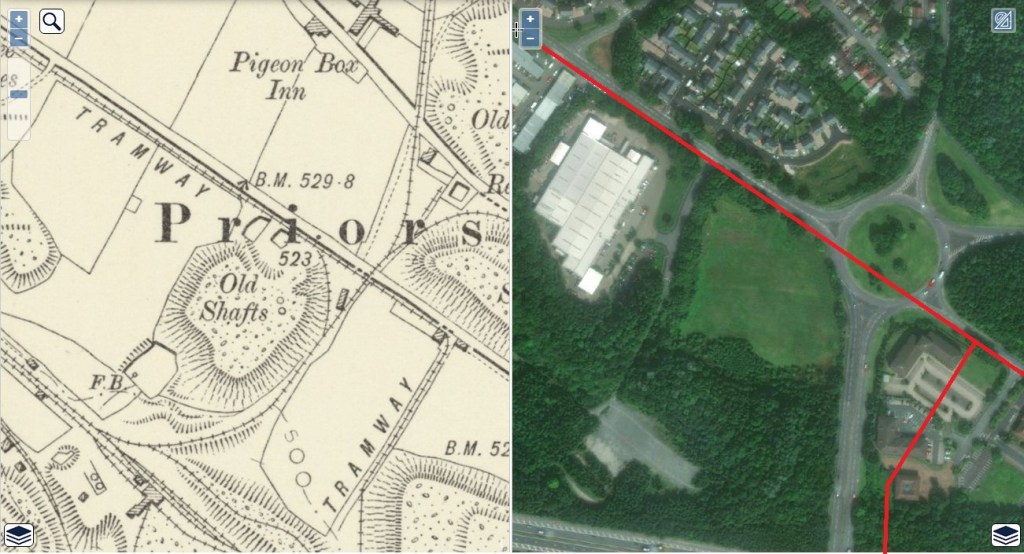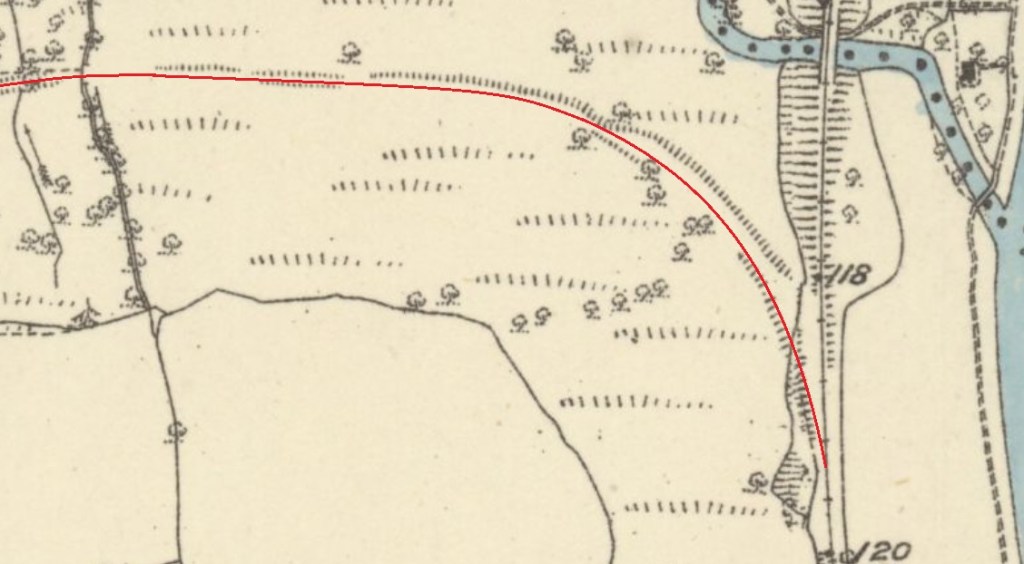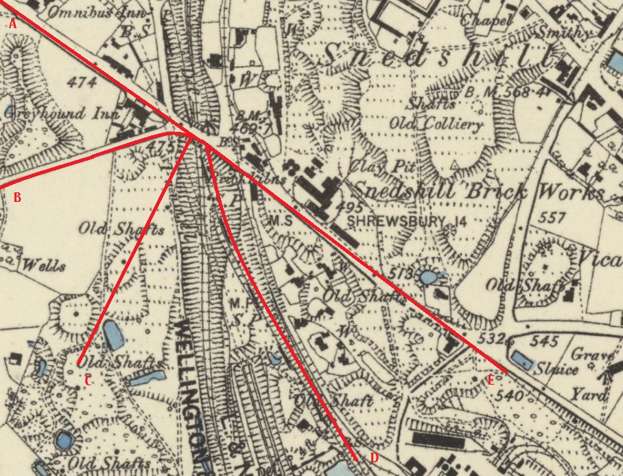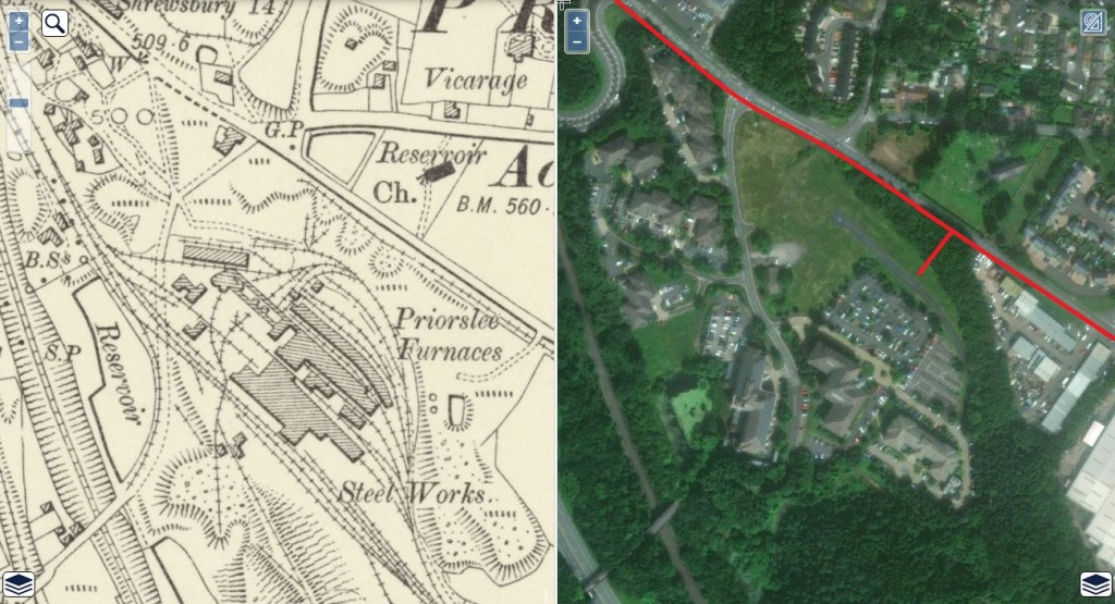 On the extract from the satellite imagery below the line is picked up running approximately along Downemead before crossing Dale Acre Way once again. At the point where Downemead meets Dale Acre Way at its North end, Dale Acre Way is running approximately along what was Dark Lane shown on the 6″ Ordnance Survey immediately below. Comparing the two images immediately below shows how much topographic change has occurred in the 120 years since the 1901 Ordnance Survey. Effectively the only feature which remains in the 21st century is the Shrewsbury to Wolverhampton Mainline railway which runs from top-left to bottom-right across both the map and the satellite image.
