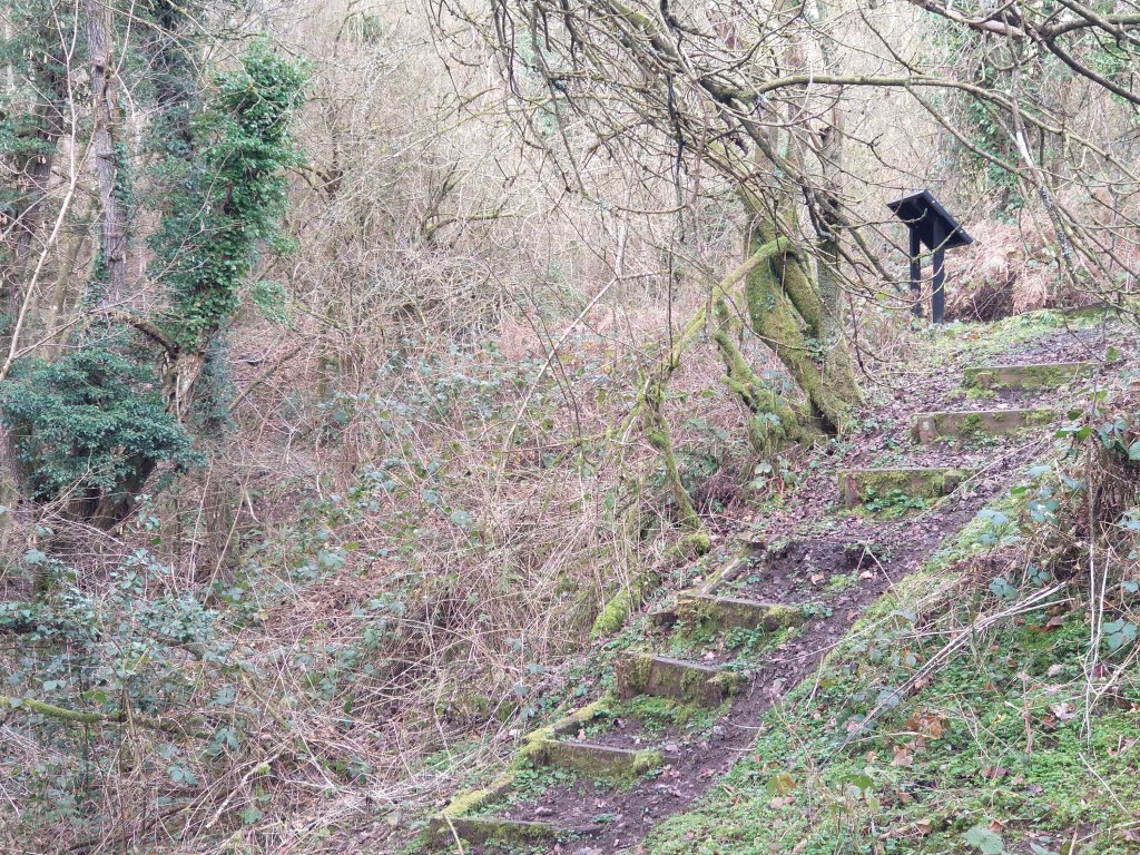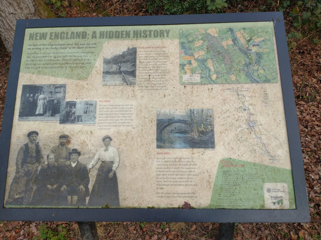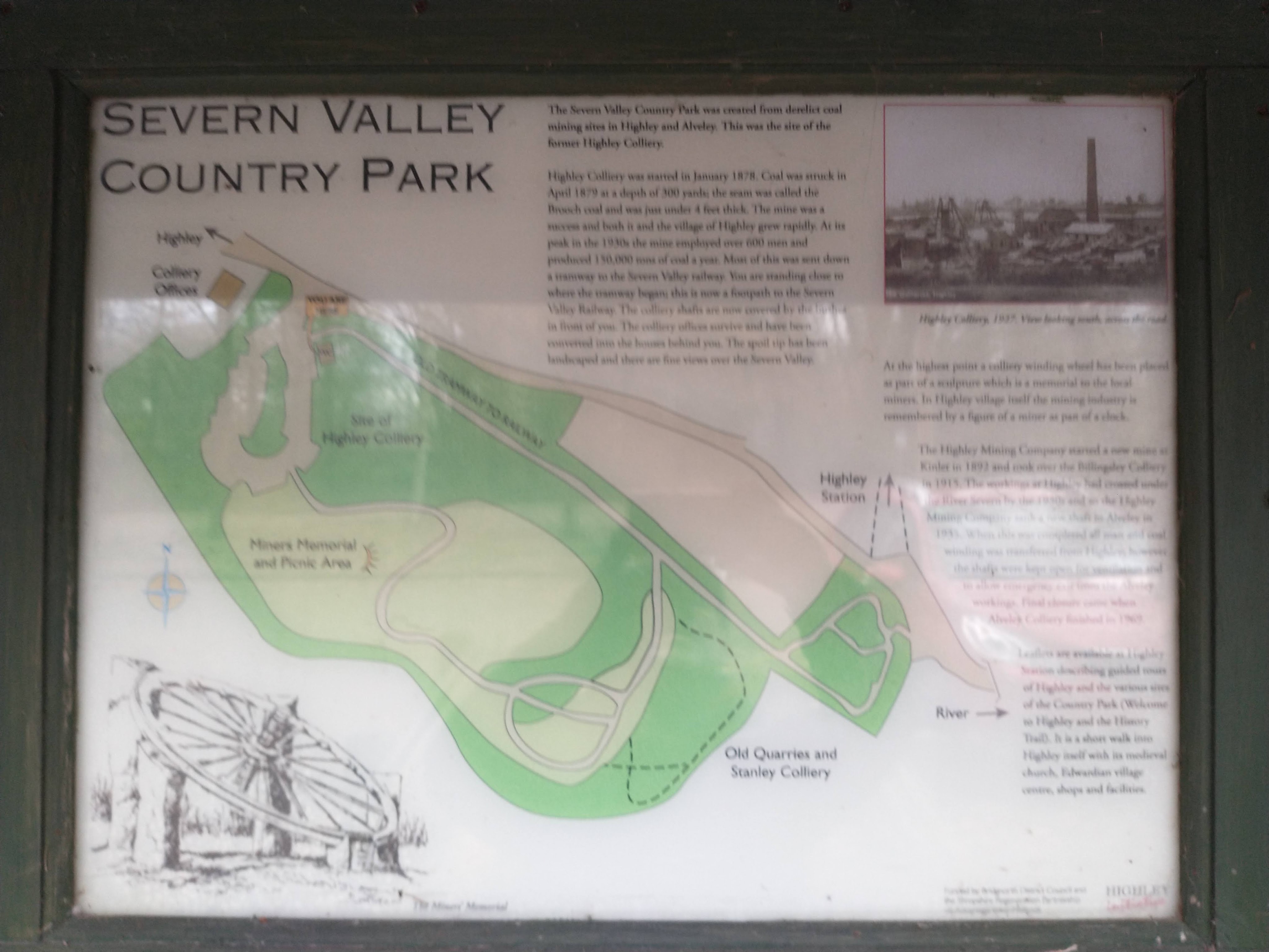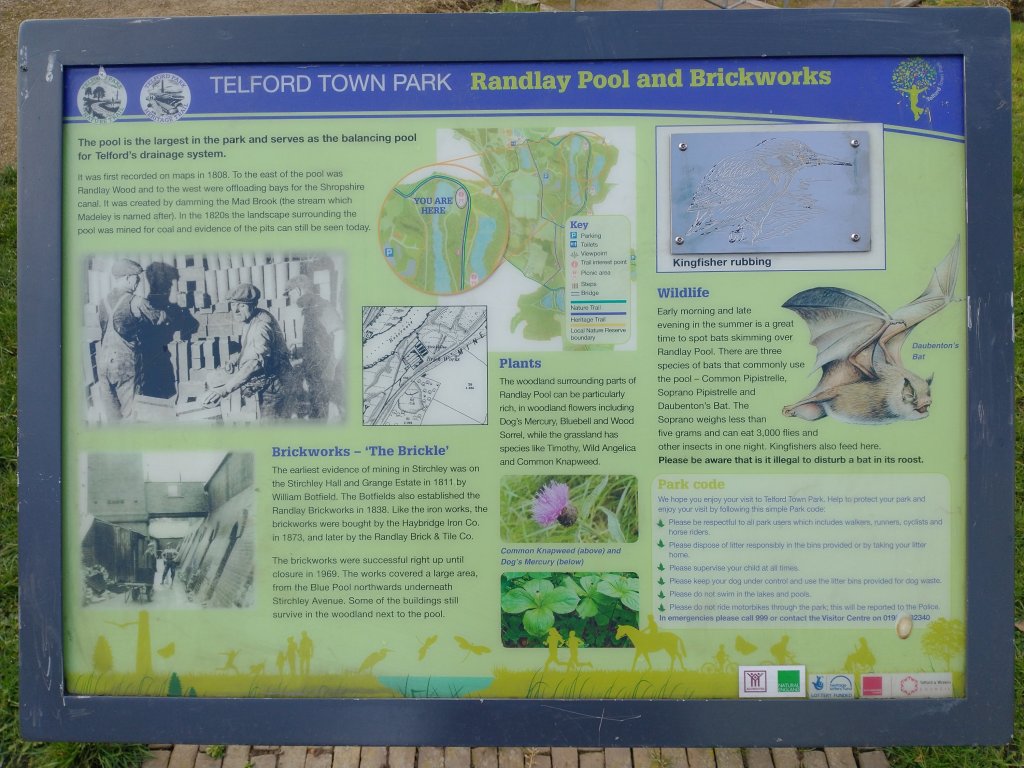 The information board reads: “From at least 1882, the Great Western Railway (GWR) ran a mineral railway from Hollinswood down the Randlay valley to serve the coal and iron industries in Stirchley. Within the Town Park, this followed a course from Randlay Brickworks to the Grange. … The Mineral Railway stopped travelling South to the Grange between 1903 and 1929 and terminated at the Wrekin chemical works. [These were at the present location of Stirchley Chimney.] Its use finally reached the end of the line in 1954. The line of the Mineral Railway is preserved today on this pathway and evidence remains including posts, buildings and artefacts.” There is also a note on the board about a network of sidings which linked various industrial works to the main line of the mineral railway alongside a sketch-map of the area.