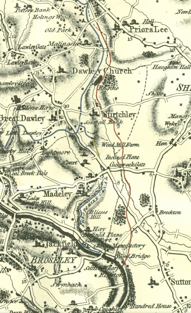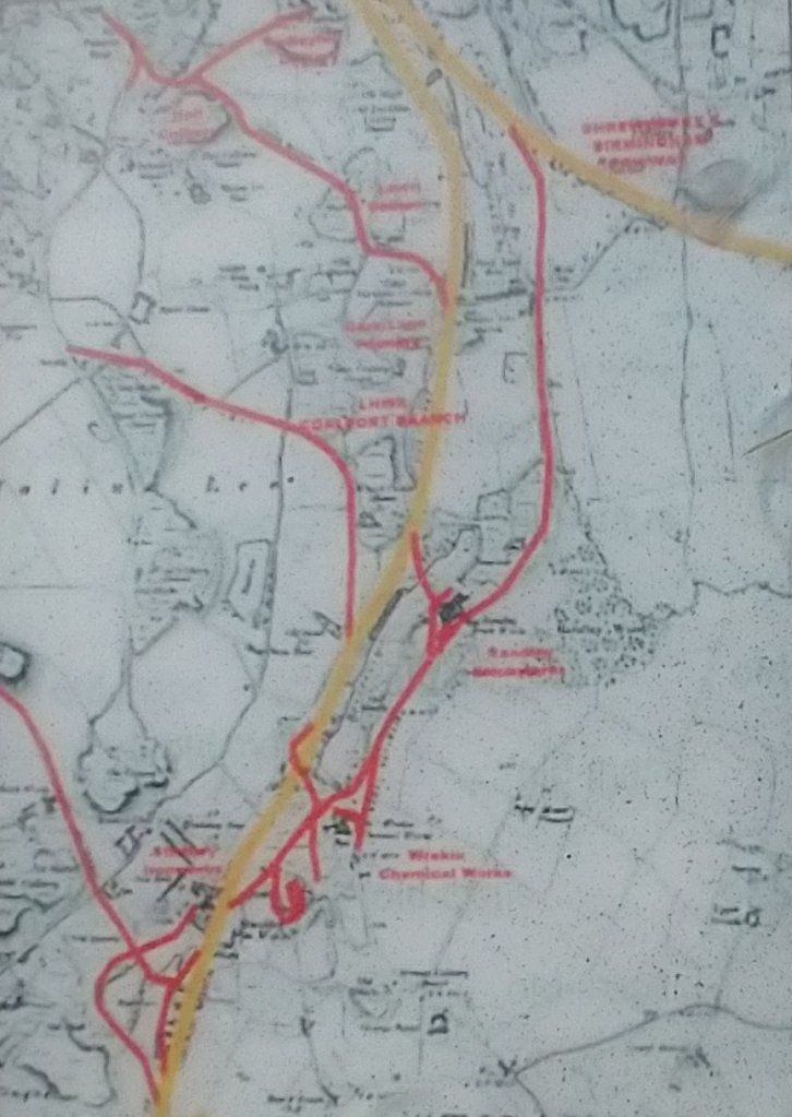 The line is shown in red ink, the Shropshire Canal is the heavy black line. The dotted and dashed thin lines are later railway routes. The short red dashes at the North end of the tramroad indicate that the route of the tramroad is not as certain as the length shown in continuous red ink.