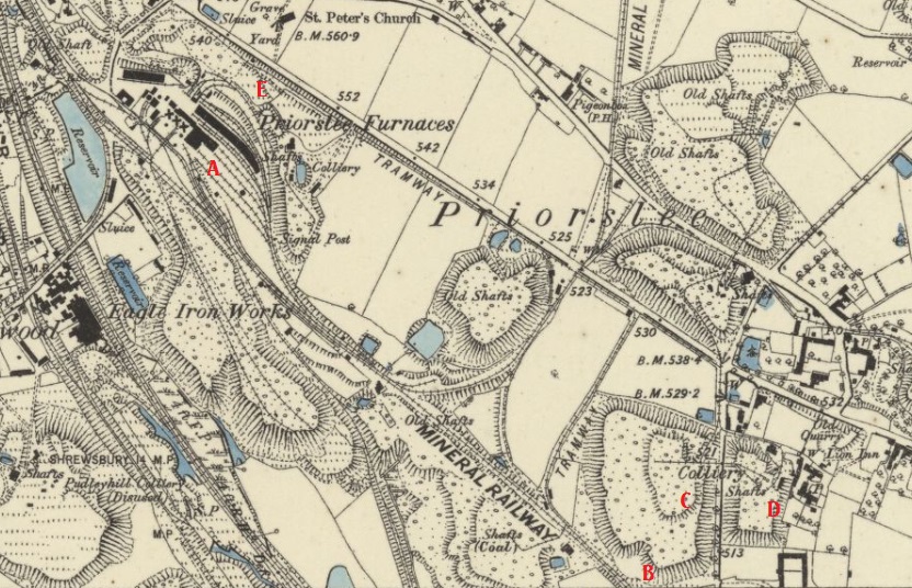 “By 1856, further tramways had been laid around the area of Snedshill Ironworks linking to the canalside warehouses, and branches reaching out to the waste heaps south and west of the ironworks. These spoil heap lines continued to expand in subsequent years around the Priorslee Ironworks, and south therefrom.” [1: p35]