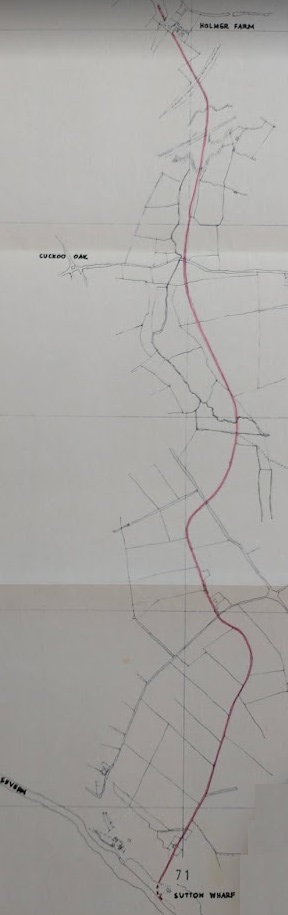 The second series of plans provided by Savage and Smith are to a scale 6″ to a mile. At this larger scale, it at first seems that they are not prepared to show the same level of certainty over the actual route of the tramroad than on the 1″ to a mile map above. In fact the difference between the two lines shown has as much to do with the scale of the source mapping used. The long dashed red line in the more northerly section of the plans produced here indicates that the route was obtained from a 0.5″ to a mile plan. So they acknowledge that, while the route definitely existed, issues with scaling inevitably mean that there is greater uncertainty over the detailed alignment. We are probably best advised to see the route from Sutton Wharf to Holmer Farm as relatively reliable and to check the detail of the route from that point North. The 6″ to a mile plan is a fold-out plan and because of its length, difficult to photograph.