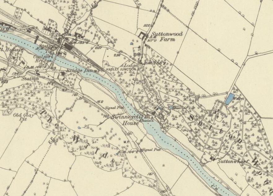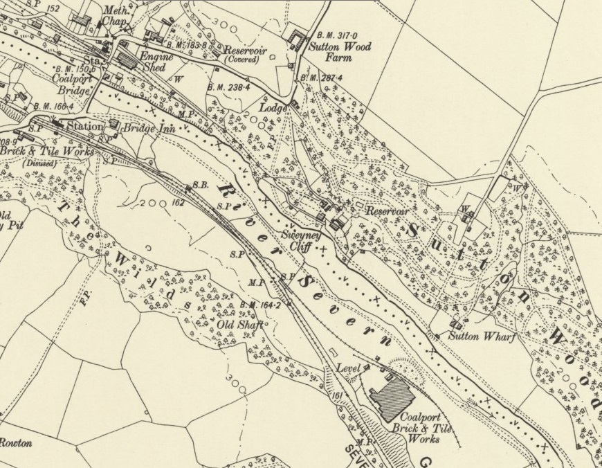 The 6″ Ordnance Surveys of 1881/82, published in 1883 and of 1901, published in 1902 show the railways serving the immediate area to the West and South of Sutton Wharf. The GWR Severn Valley Railway is to the South of the River Severn with its station close to Bridge Inn. The LNWR Coalport Branch is on the North side of the Severn. The two stations are linked by Coalport Bridge.