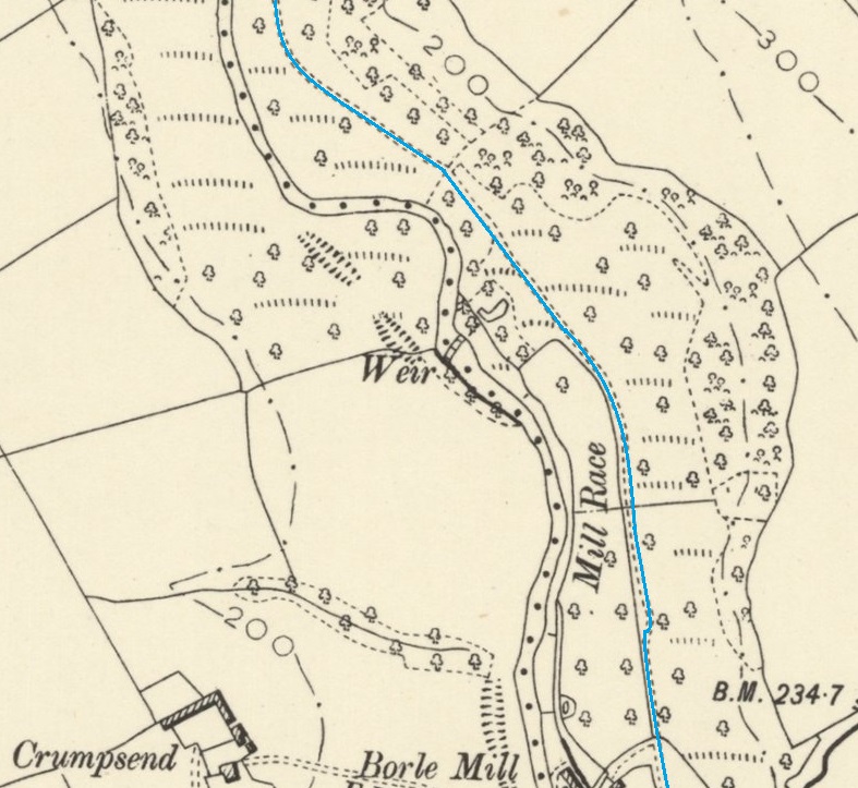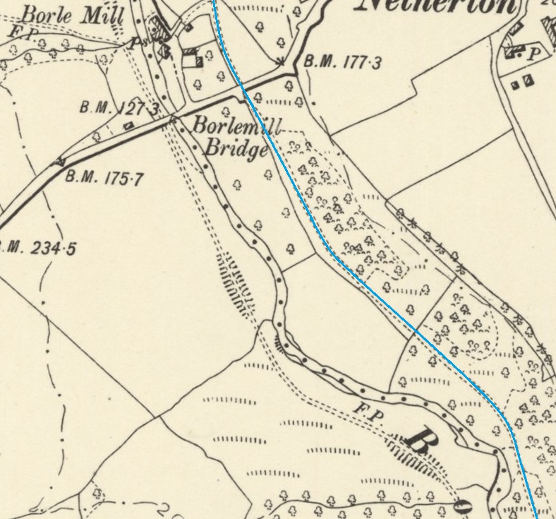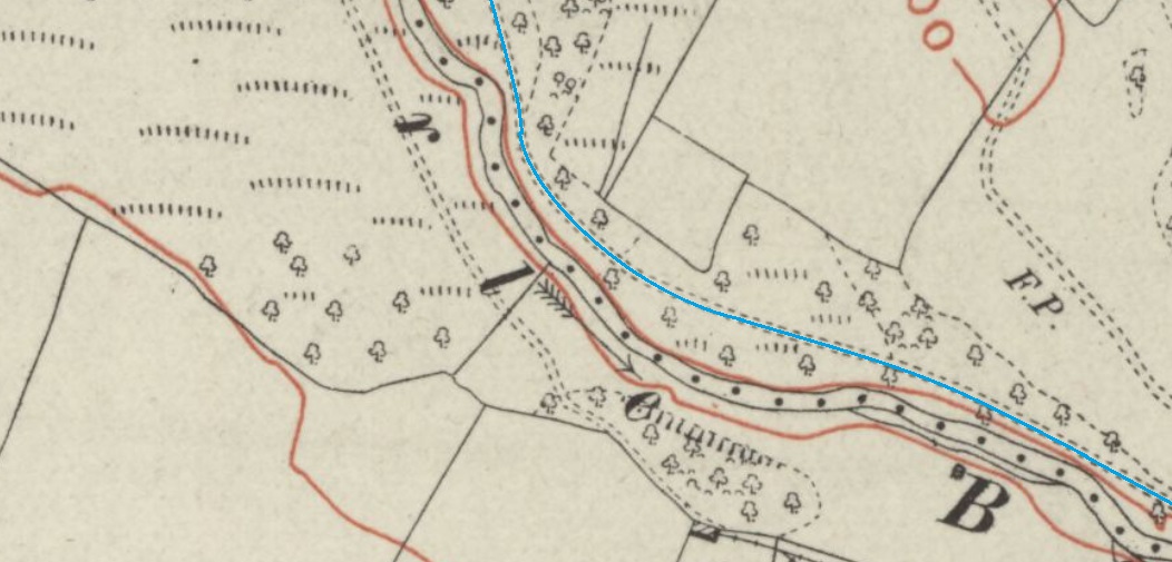 The next opportunity to look at the line of the tramroad comes at the point where its route is joined by a footpath which appears on the 1882 Ordnance Survey above and still is in existence today. The route appears on the modern 1:25,000 Ordnance Survey Explorer Series mapping as shown below.