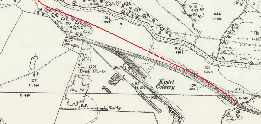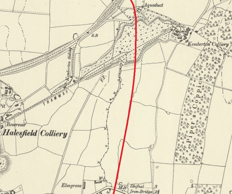 Two collieries appear on the 1901 OS mapping – Halesfield and Kemberton Collieries. These would not have been present when the tramroad was active in this area. By the 1950s these two pits were worked as one by the NCB and together employed over 800 men. “John Anstice sank Kemberton Pit when director of the family company in 1864 mainly for coal but it also produced ironstone and fireclay. … Halesfield was sunk as an ironstone and coal mine in the 1830s and continued to work coal until the 1920s, it later became the upcast and pumping shafts for Kemberton pit.” [13]