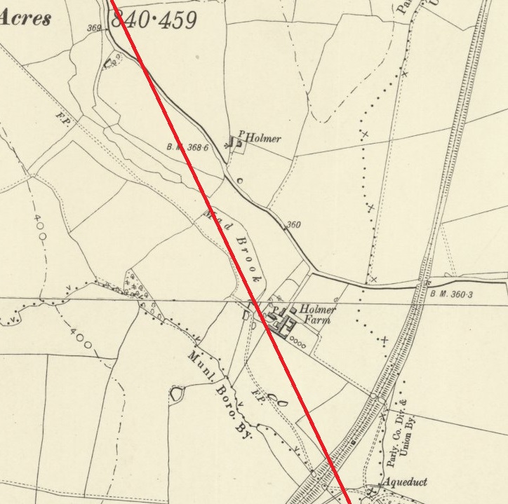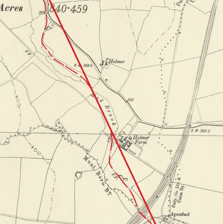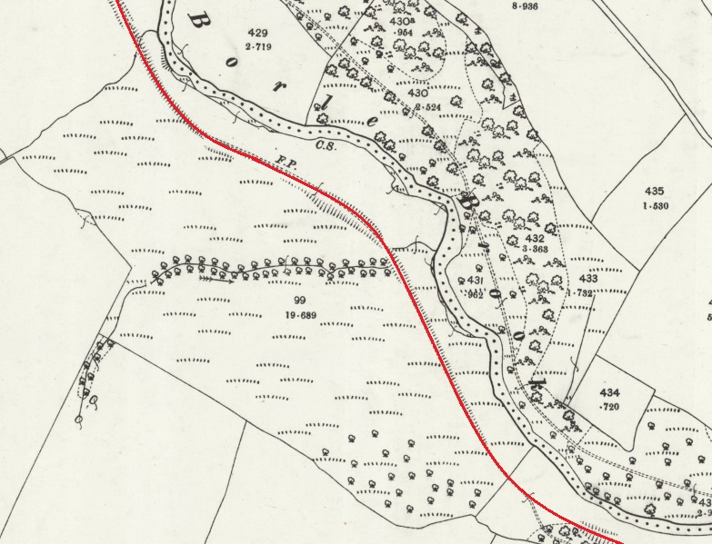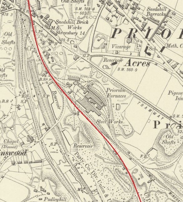 On the extract from the satellite imagery below the line is picked up running approximately along Downemead before crossing Dale Acre Way once again. At the point where Downemead meets Dale Acre Way at its North end, Dale Acre Way is running approximately along what was Dark Lane shown on the 6″ Ordnance Survey immediately below. Comparing the two images immediately below shows how much topographic change has occurred in the 120 years since the 1901 Ordnance Survey. Effectively the only feature which remains in the 21st century is the Shrewsbury to Wolverhampton Mainline railway which runs from top-left to bottom-right across both the map and the satellite image.