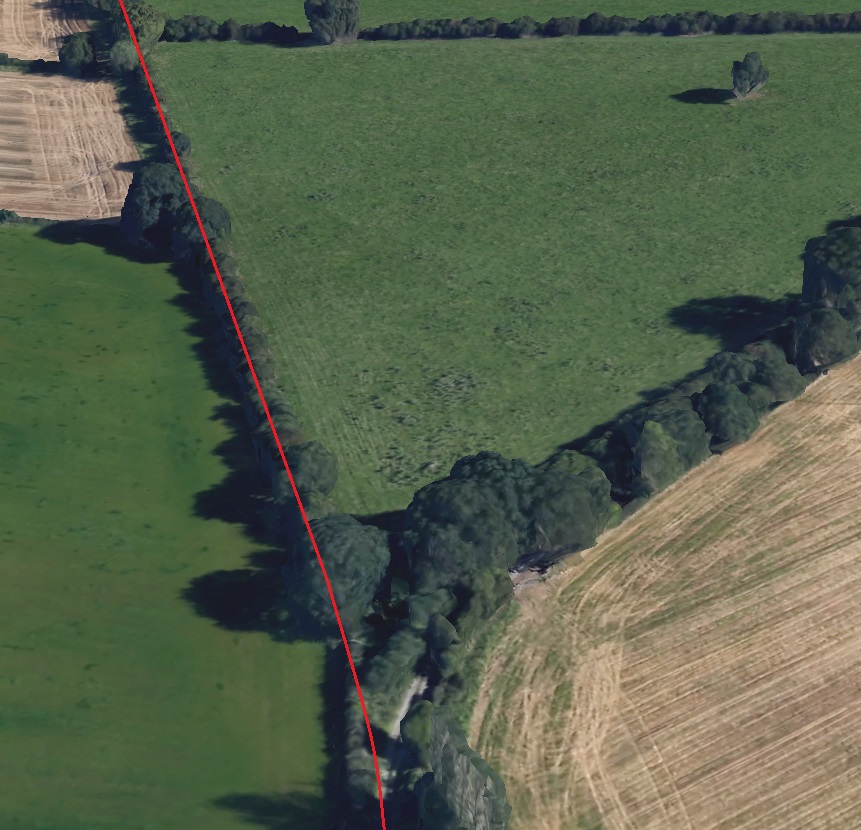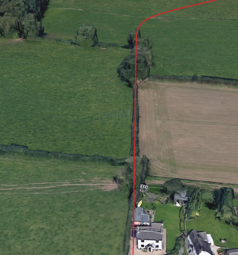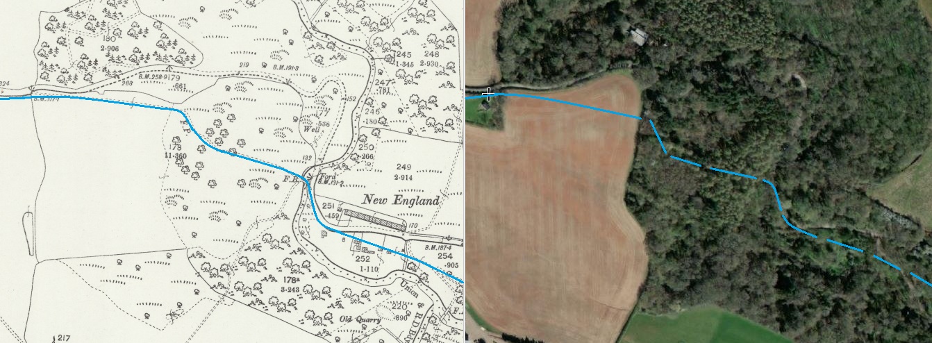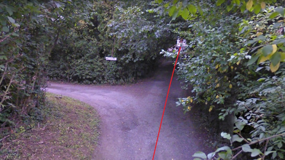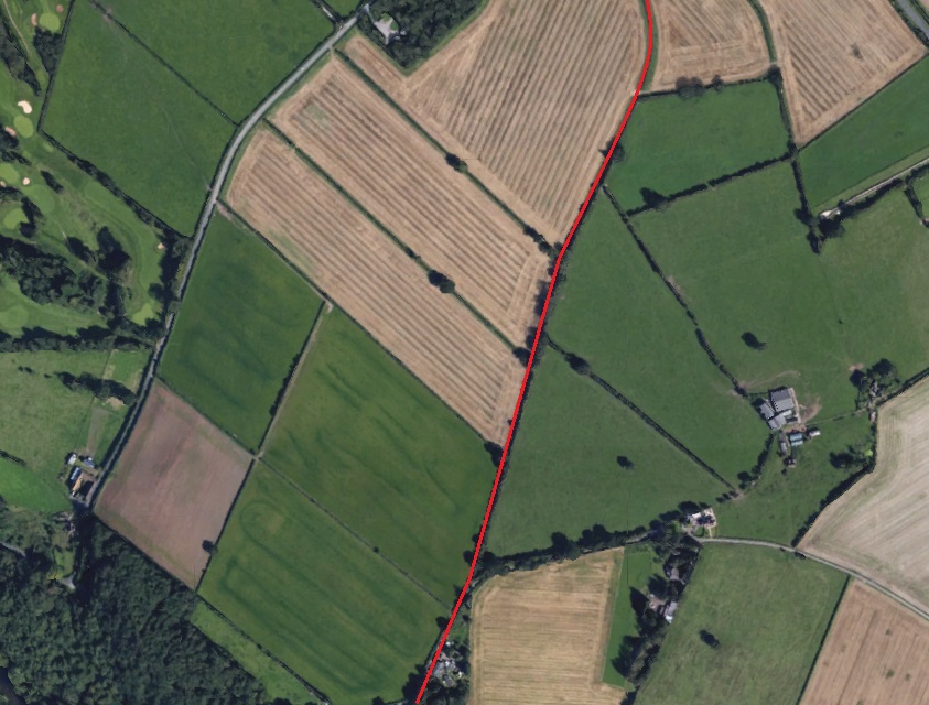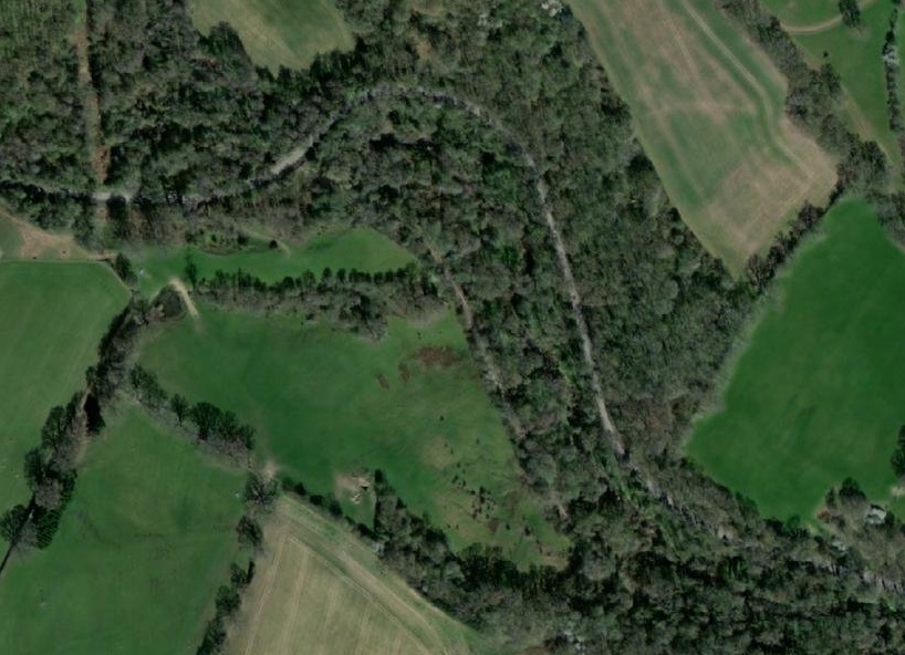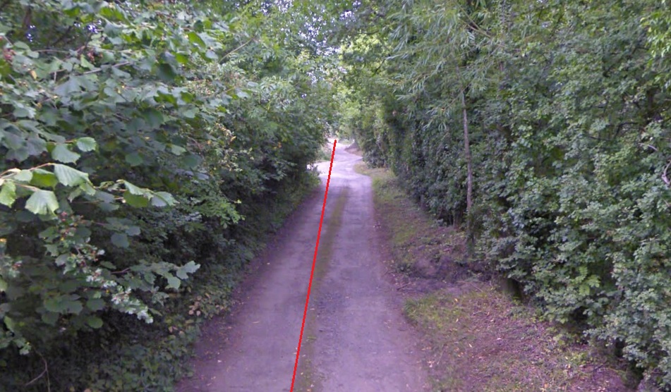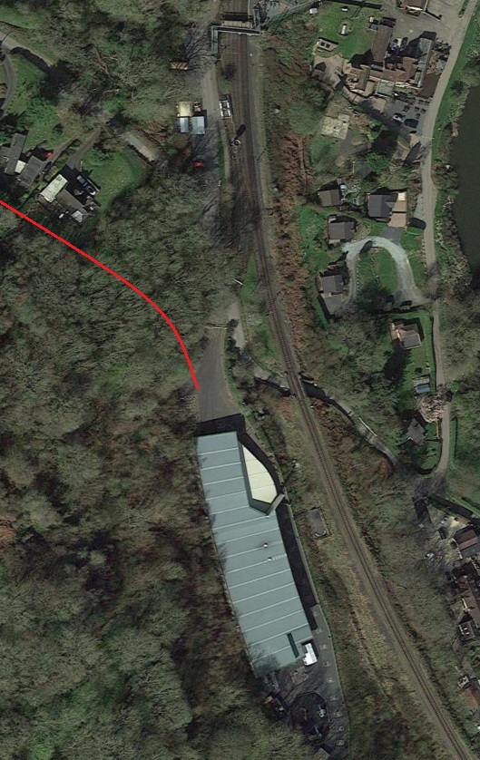 Our discussion about the old tramroad alignment is essentially speculative. We are in a better position than Savage and Smith were to trace routes using modern technology, but even so our possible route remains speculative. I have reproduced in in approximation on the same modern satellite image as were encountered above. Should it be correct, then some of its route can be followed and some locations can be photographed but all with a healthy sense of scepticism.
