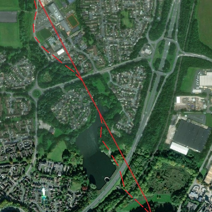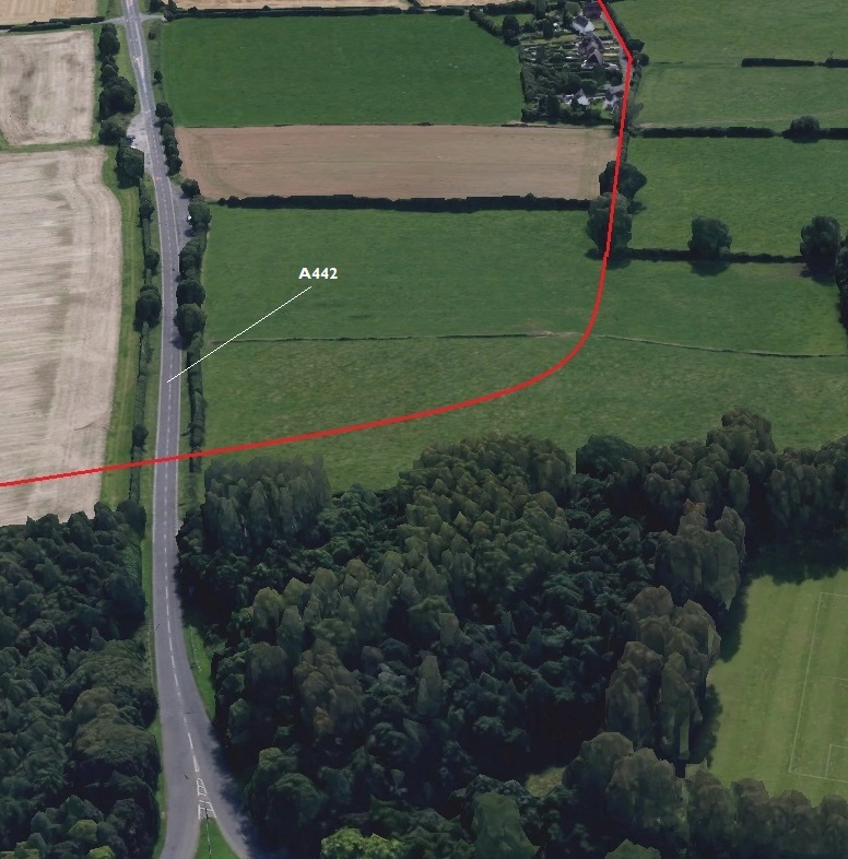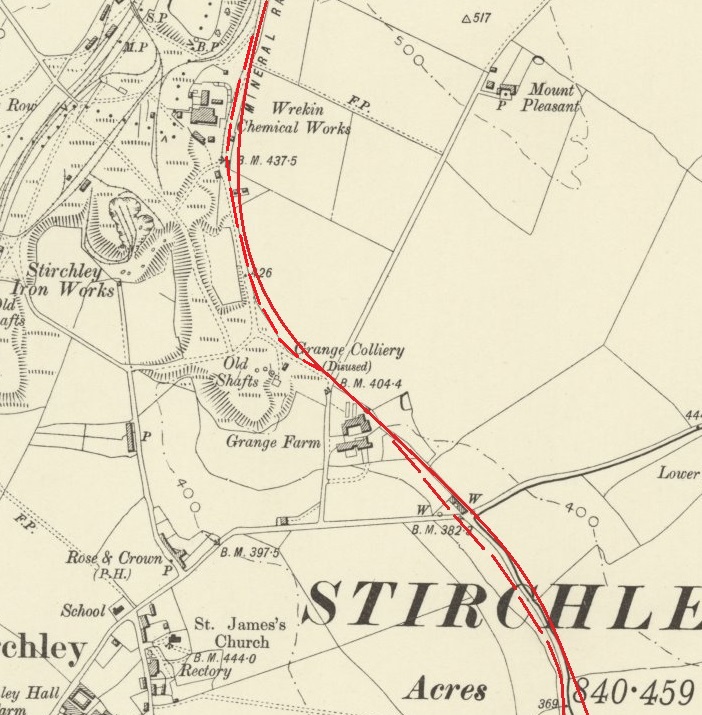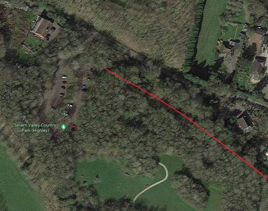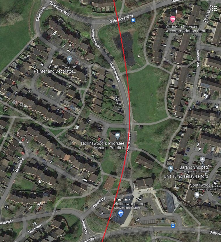 North of Randlay Pool the line of the old tramroad and the line of the GWR Mineral railway plunge into undergrowth and the topography of the area beyond this point for some distance is very unlikely to be the same as that present in 1901. In the top half of the satellite image above the lines crossed three modern roads, Stirchley Avenue, Queen Elizabeth Avenue and Dale Acre Way, then run geographically along the line of Downemead for a short way.