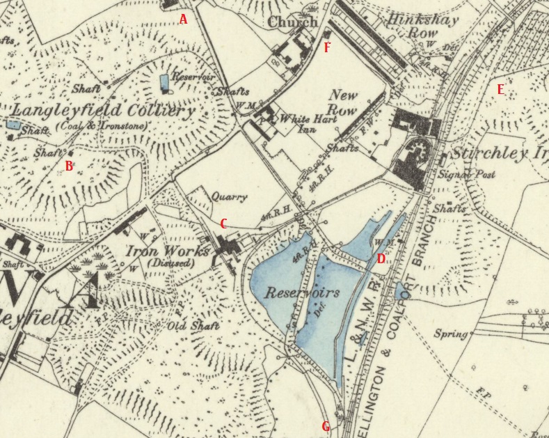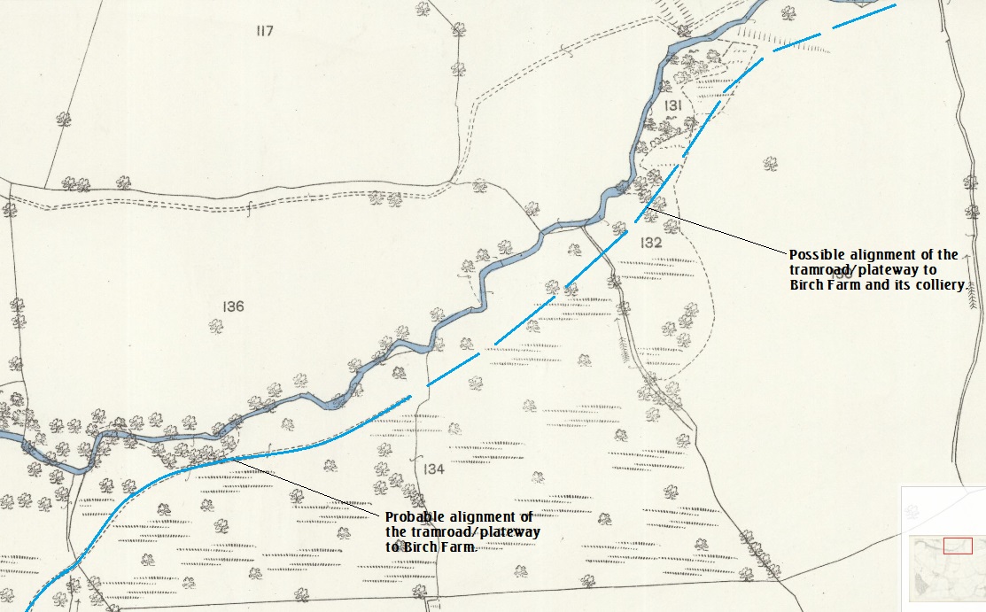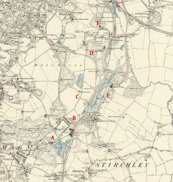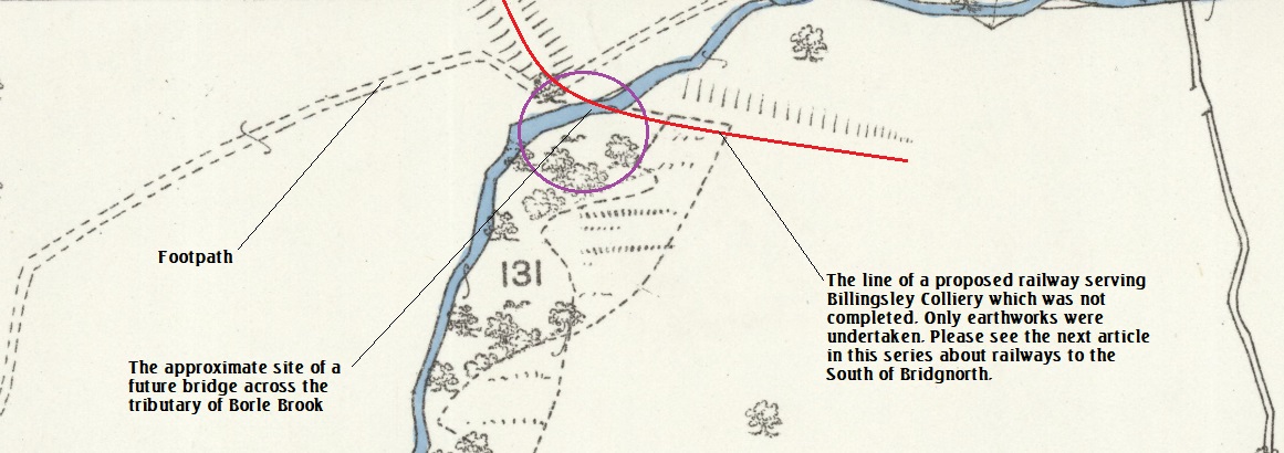 The next length of the old tramroad brings us passed the site of Grange Farm and Grange Colliery, Stirchley Ironworks and close to Randlay Pool. Mad Brook meanders North, initially close to the line of the old tramroad, moving away West beyond Grange Farm and then getting lost in the midst of Stirchley/Oldpark Ironworks.