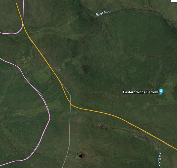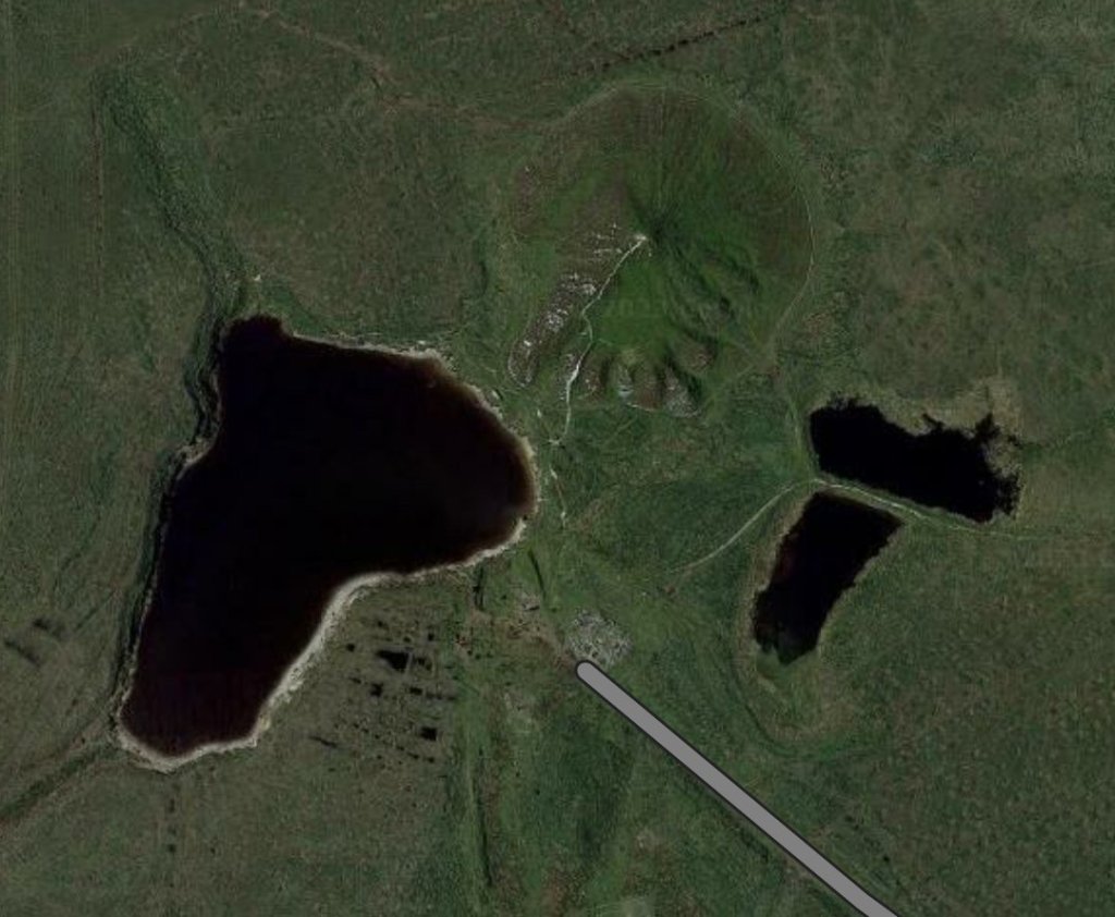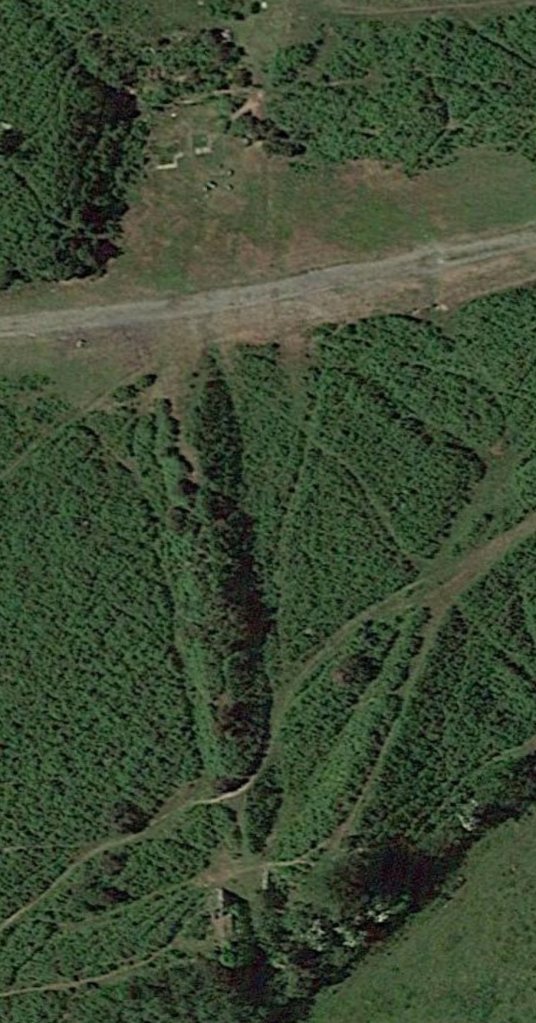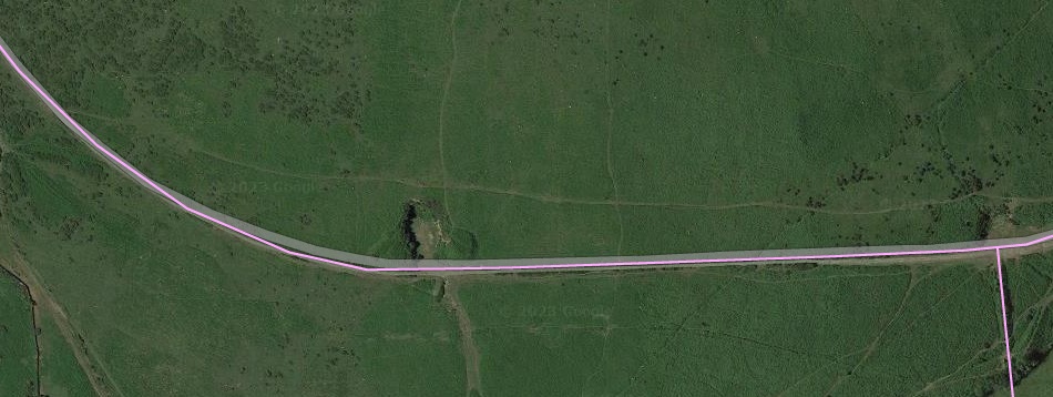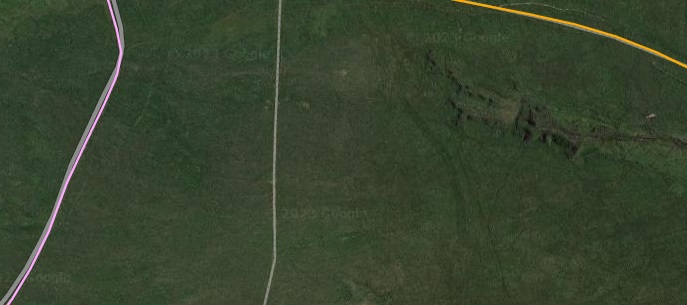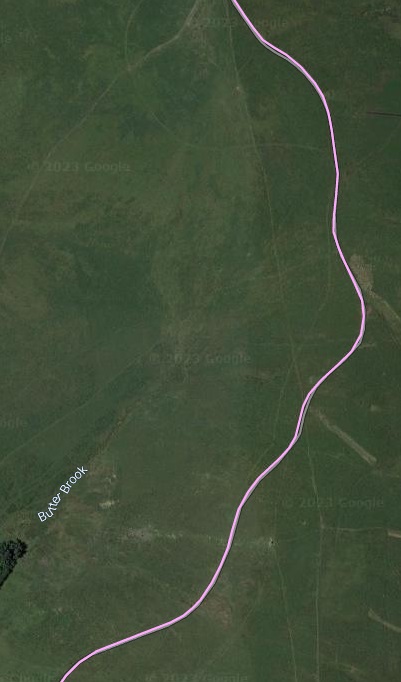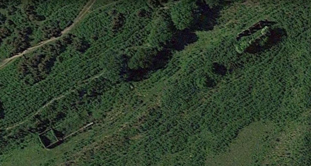 This next extract from the satellite imagery of railmaponline.com covers approximately the same area as the two OS Map extracts above. It shows the route of the Redlake Tramway continuing in a northerly direction with little of obvious note on the route. Grasscombe Ball and Piles Hill are not obvious at this magnification. [13]