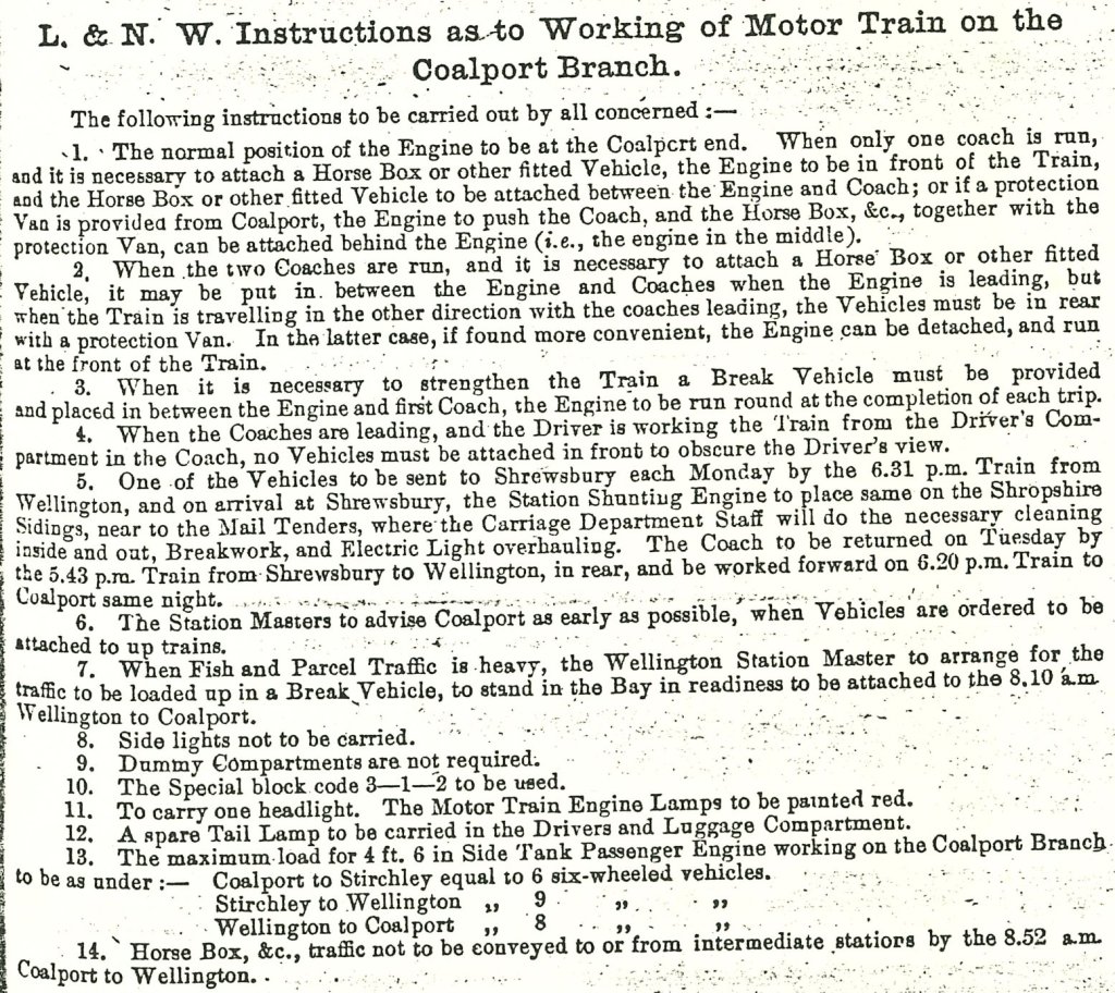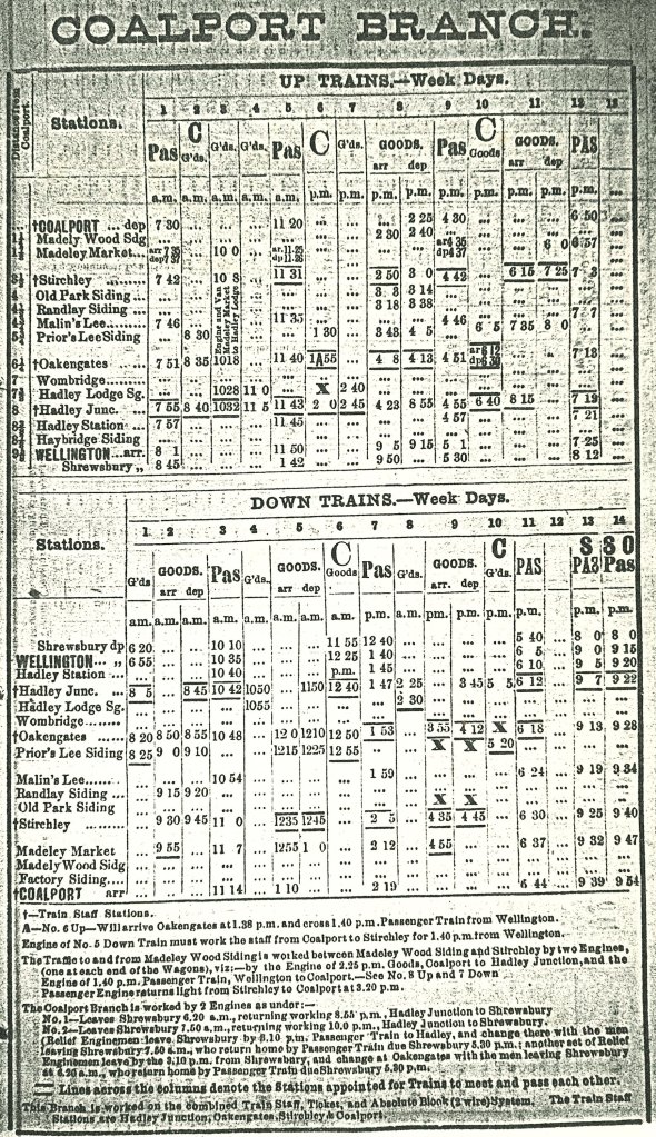 The original train service consisted of three passenger trains in each direction between Wellington and Coalport, with a similar number of goods workings. This modest service persisted for many years, although an additional Thursdays-only train was subsequently provided in response to the increased demand on Wellington market days. In 1888 the branch was served by four passenger trains each way, together with five Up and three Down goods workings. By the summer of 1922 there were five Up and five Down passenger trains, with an additional short-distance service from Wellington to Oakengates and return on Saturdays-only.