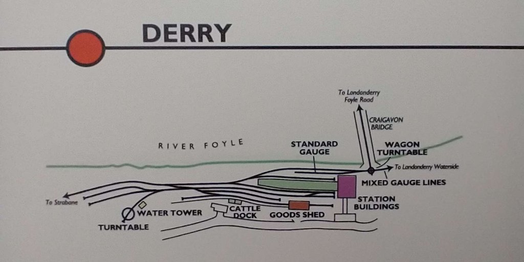 Strabane Railway Station opened in 1863 and was due to close in 1959, however, it remained open to goods until 6th February 1960 because road improvements necessary for lorries had not been completed by 31st December 1959. Strabane was approximately 13 miles from Stranorlar. Strabane to Stranorlar was the first stretch of line in Co. Donegal. The line was built by Finn Valley Railway as 5’3″ gauge. It was re-gauged to the narrow (3′) gauge in the summer of 1894 over only one weekend to match with the rest of the Donegal network! The partition of Ireland in 1922 led to serious delays and other complications for the Railway. All of its extensive freight traffic and all passengers had to clear through customs at Lifford (Republic of Ireland) and Strabane (Northern Ireland). [My photograph, 22nd April 2023]Derry Railway Station was opened in 1900 and closed.in 1954. It was just under 15 miles from Strabane. The County Donegal Railway’s own line to Derry improved the handling of the substantial through goods traffic of imported coal from the Foyle quayside to the many customers throughout the system. This station was adjacent to the twin-deck Craigavon Bridge which, at its lower level, gave rail access to Derry’s three other railway stations and the Harbour Commissioners’ own lines. The Derry line was always steam worked for both passenger and freight services. This was to gain maximum benefit from cheaper coal in Northern Ireland and to save depleting stocks at the company’s depot at Strabane. [My photograph, 22nd April 2023]