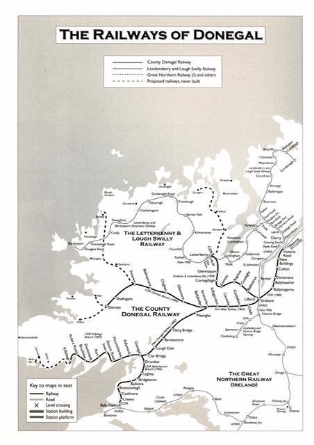 The Railways of County Donegal. This map of the lines in Co. Donegal includes those which were considered as possible extensions and shows them as dotted lines. The line between Killybegs and Teelin Pier is shown bottom-left of this image. [2]