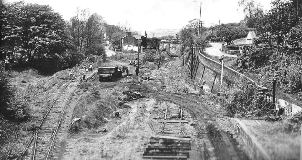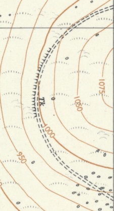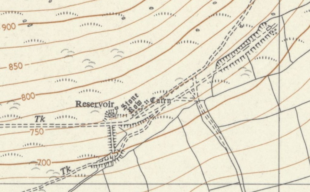 The route of the old line, while generally moving Northwards was seeking the shallowest gradient possible and consequently curved with the contours of the land but continued rising relatively steeply. On the adjacent extract from the 25″ National Grid edition of the Ordnance Survey, the line switches back again and as it does so, rises through the 1000ft and 1025ft contours. [14]