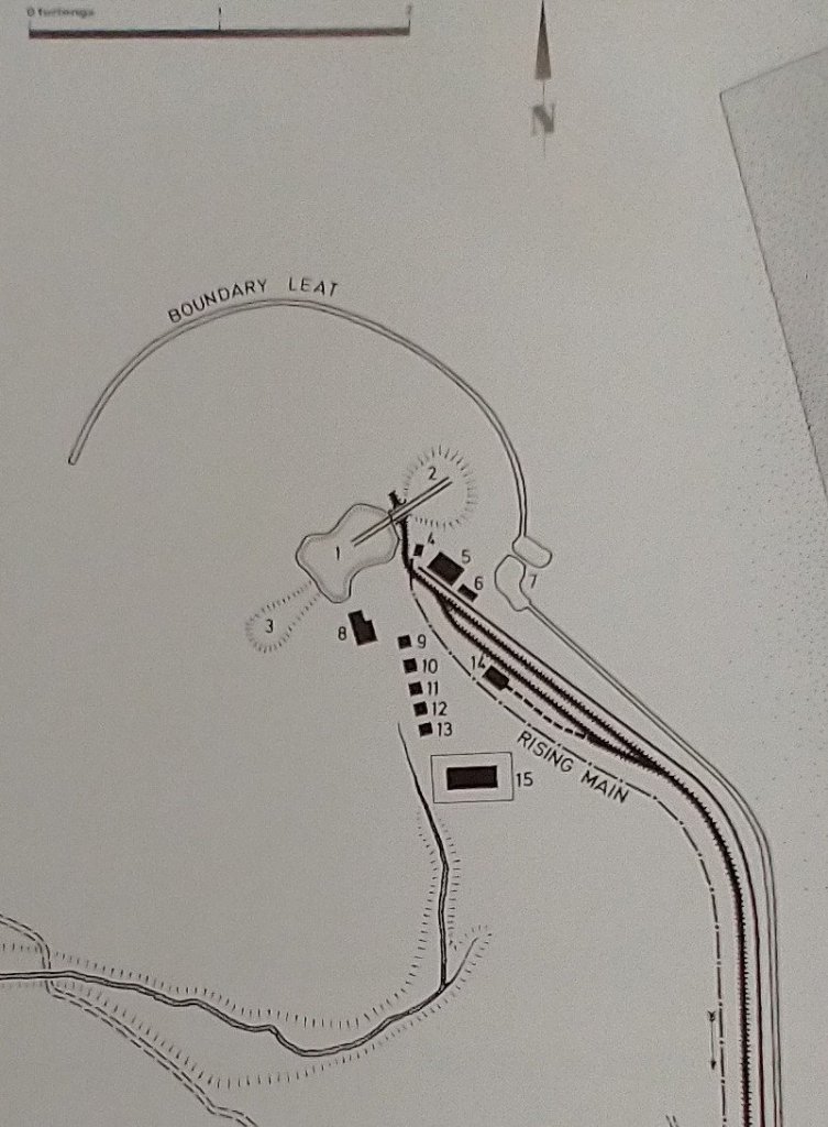 This is an extract from one of Wade’s drawings. It shows the immediate location of the Red Lake clay-workings. The numbered locations are: 1. The main clay pit; 2. The incline and the spoil heap; 3. The tipped overburden; 4. The winding engine;. 5. The engine and boiler house; 6. The coal house; 7. Artificial reservoirs; 8. The peat house; 9. The drying room and store; 10. The dining room; 11. The Smith’s shop; 12. The Carpenter’s shop; 13. The Office; 14. The Loco Shed; 15. The hostel. [1: p50]
