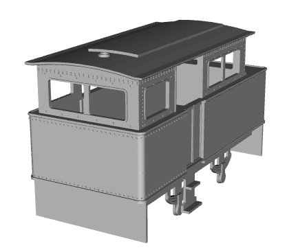 The locomotive ‘C.A. Hanson’ on the tramway at the head of the incline which ran steeply down to the works at Cantrell off to the right of the picture. [50]The same locomotive along with two wagons and what appears to be the line’s bogie coach. The photograph was taken on 11th September 1911 on the occasion of the opening of the line. [50]3D model of ‘C.A. Hanson’ advertised by rue-d-etropal.com for bespoke 3D printing. [49]