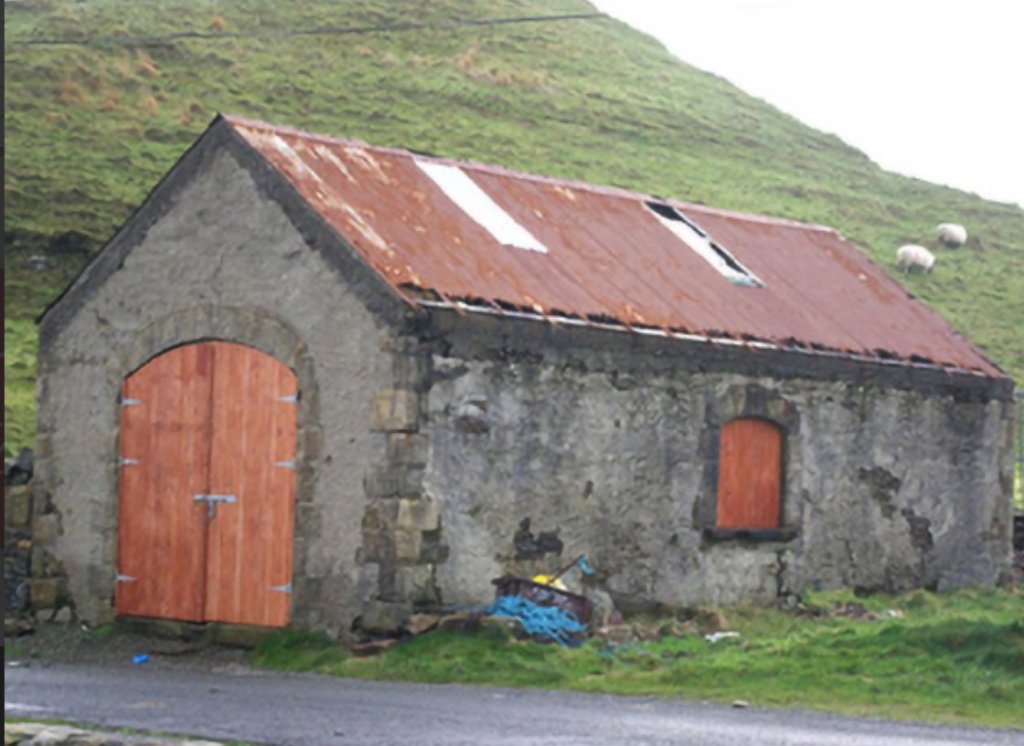 2. The engine shed. Sadly, the origins of this building are well documented and have nothing to do with any old railway. It is a detached gable-fronted single-bay single-storey former coastguard boathouse, built in 1871, originally associated with Teelin Coastguard Station. Now in use as a private boathouse. When surveyed it was described as having a “pitched corrugated metal roof. Roughcast rendered finish over rubble stone construction with rock-faced ashlar sandstone block-and-start quoins to the corners of the front elevation (north) with dressed margins. Single segmental-headed window opening to the centre of each side elevation (east and west) having rock-faced ashlar sandstone block-and-start surrounds with dressed margins, cut stone sills; openings now blocked. Segmental-headed carriage-arch to the front elevation (north) having rock-faced ashlar sandstone block-and-start surrounds with dressed margins, and with replacement timber double-doors.” [3]