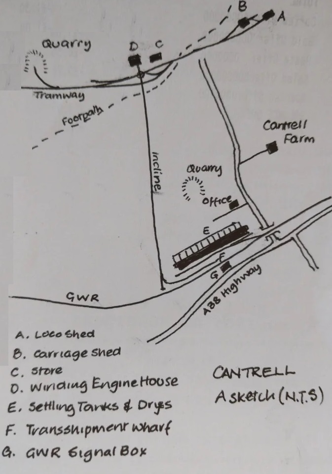 The top of the incline. The winding house can be seen just below the word ‘Reservoir’ on this extract from the National Grid revision of the 25″ Ordnance Survey mapping of 1952, published in 1954. The incline dropped down from the location of the winding house along the embankment which runs almost due South down the valley side to the Cantrell Works which feature in the previous map extract. [9]My sketch of the layout of the works and incline which led up to the Red Lake Tramway. This is based on a drawing in E.A. Wade’s book. [1: p46]