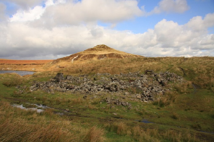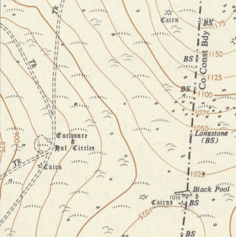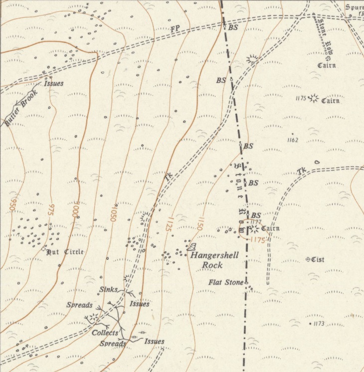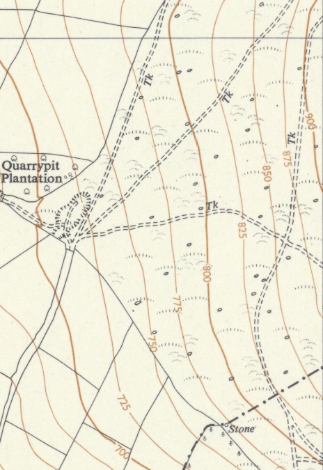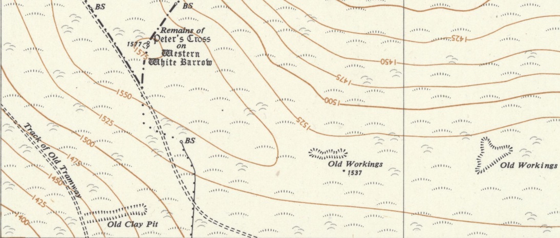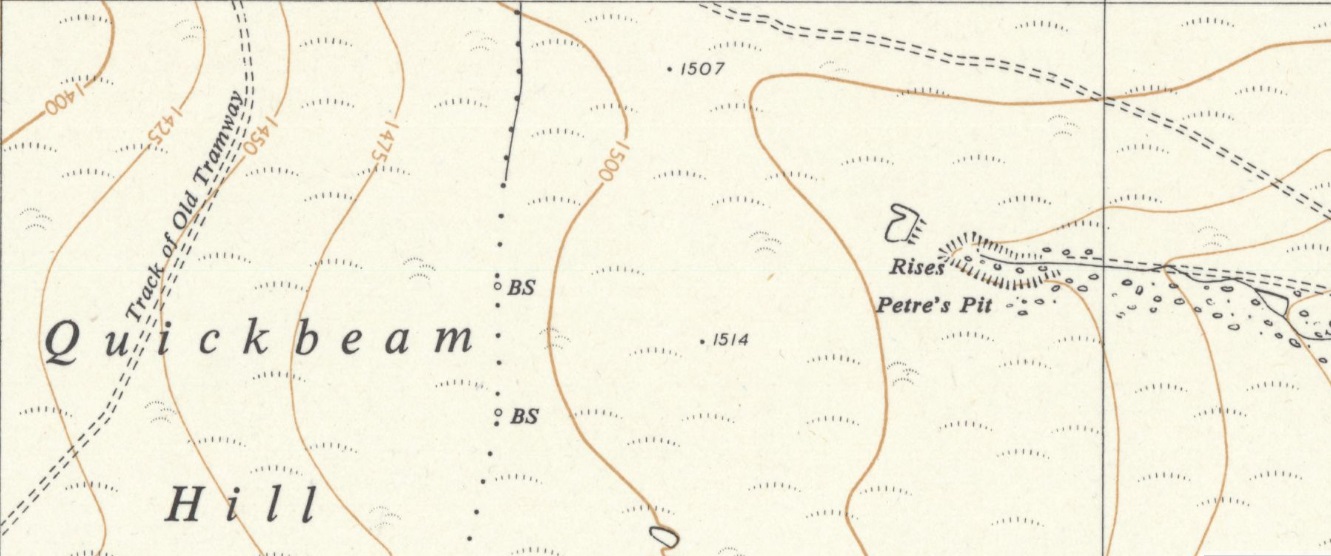 Wade describes the route North from the western flank of Western Beacon as continuing “in a generally northerly direction, with detours to the west and east to follow and gradually ascend the contours of the hills, and passes below, and to the west of Hangershell Rock … Further north at Spurrell’s Cross (2 miles 63 chains) there was a passing loop and at Three Barrows (4 miles 44 chains) there was a short siding, entered from the Cantrell direction. A small shelter stood by the points. This siding served a further stone crusher for producing ballast. The concrete base and holding down bolts for it, can still be seen beside the track. Three Barrows is a prehistoric site where the ground was a mass of small blocks of stone with very little soil. This stone was excavated and was of such an even size that there was no need to screen it before it went to the stone breaker. Apart from some small cuttings and embankments, there are no really notable features on the line until the Leftlake clay pit is reached.” [1: p46-47]