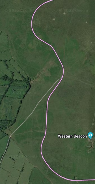Western Beacon summit is shown, towards the bottom-right of the adjacent railmaponline.com extract. The tramway route is shown in pink. The grey line running in from the bottom-left is the Two Moors Way which joins the old tramway route. [13]