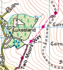 The Two Moors Way as shown on the Ordnance Survey Explorer Map OL28 – Dartmoor. The route of the old tramway appears as a double dotted lane which is unfenced.