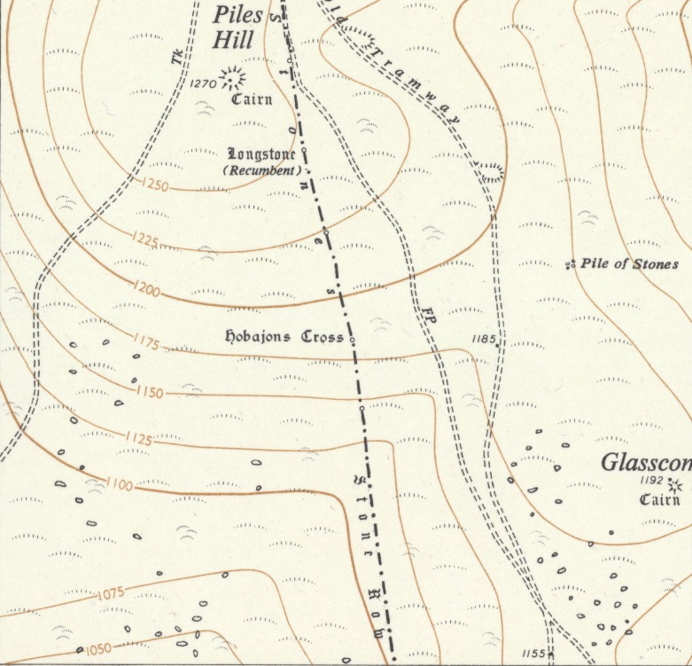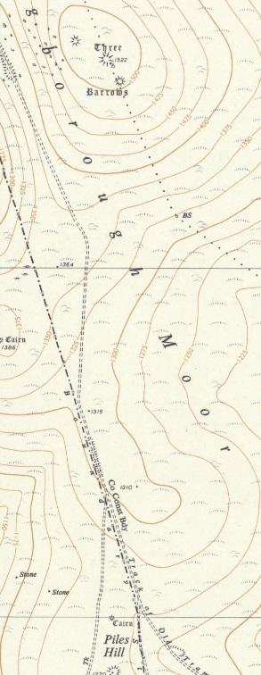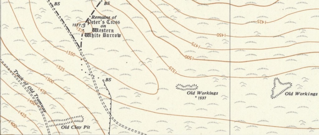 The next extract from the 1954 25″ Ordnance Survey revision undertaken for the National Grid shows the old Tramway route crossing Ugborough Moor and continuing to climb to around 1375ft above sea-level. At around 1375ft the gradient flattens out and the old line passed through a natural defile to the West of Three Barrows. A shallow cutting was necessary at this point which can be seen at the top-left of the map extract.