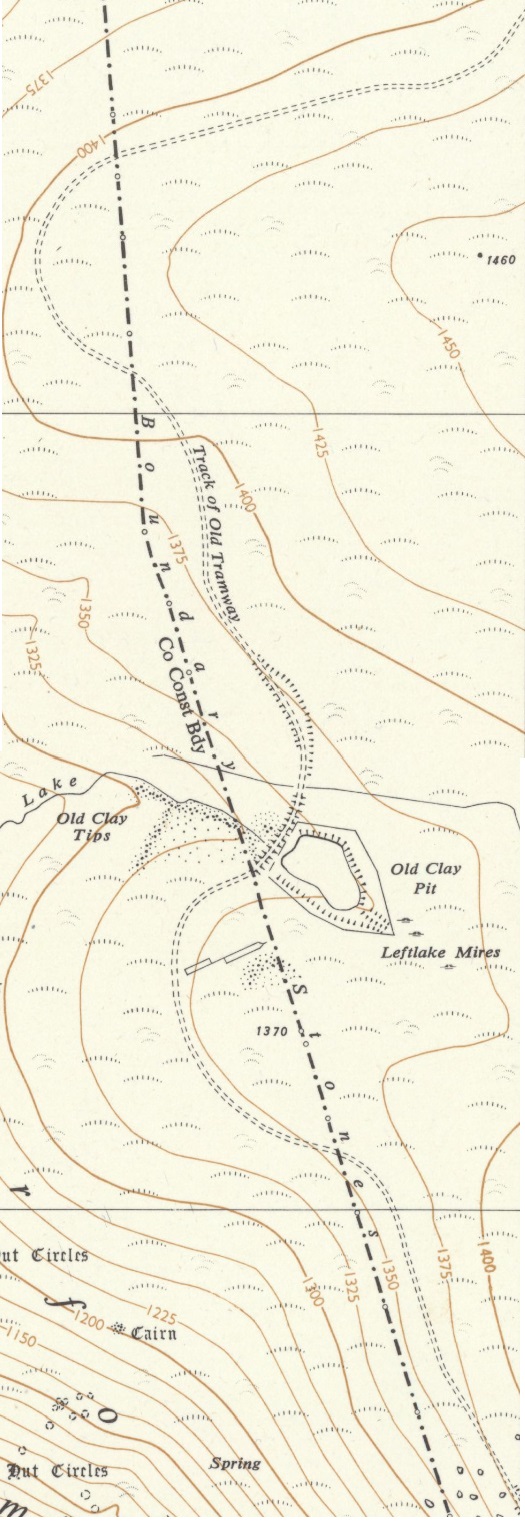 “Apart from some small cuttings and embankments, there are no really notable features on the line until the Leftlake clay pit is reached. … At Leftlake the line passes over a stone and brick bridge … and between the pit on the eastern side … and the spoil tip on the western side. Above and to the South of the pit may be seen a small area of ruined concrete sand and mica drags which refined the Leftlake clay before it passed into the pipeline [to travel down to the Cantrell Works]. A passing loop or sidingwas put in at Leftlake when the pit was reopened in 1922.” [1: p47-48]