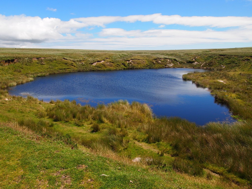 At Red Lake, we note that the spoil heap is much larger than that at Left Lake. Wade tells us that “the incline which took the wagons of waste from the pit to its peak is clearly discernable. This incline was not, of course, connected with the tramway proper and was of a different gauge. The large pit is now completely filled with crystal clear water and the banks drop away at an alarming angle. The original layout of Redlake was complex. … The lease extended to an area of some 1,300 acres but only a tiny proportion of this was ever worked; the pit itself eventually covering approximately 32 acres. In the main shaft, which was 130 feet deep, were fixed two pumps of the vertical single-acting, outside packed ram type; there being four rams, 13¼ inches in diameter with a six feet stroke. The cast iron column was 15 inches in diameter.” [1: p49-51]
