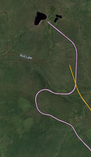 These two images show the remaining length of the Red Lake Tramway with the Red Lake clay workings shown towards the top of both images. The first (on the left) comes from the OS Sheet SX66NW from the 1954 revision undertaken for the National Grid. The second is approximately the same area as it appears on the satellite imagery provided by railmaponline.com [13]