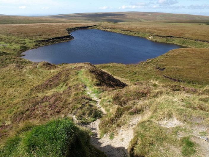 “The trackbed is lined at various points with marker posts, disused quarries and earthworks. Towards the top of the ascent are Leftlake and Redlake itself. Both are abandoned pits that have been flooded, creating lakes (the word “lake” in both names derives from the streams flowing through the areas, not the artificial lakes, which are recent features). There is a robust stone bridge at Leftlake, with a rudimentary name plaque engraved in mortar. At Redlake there are the remains of a demolished pumphouse, along with other ruins.” [5]