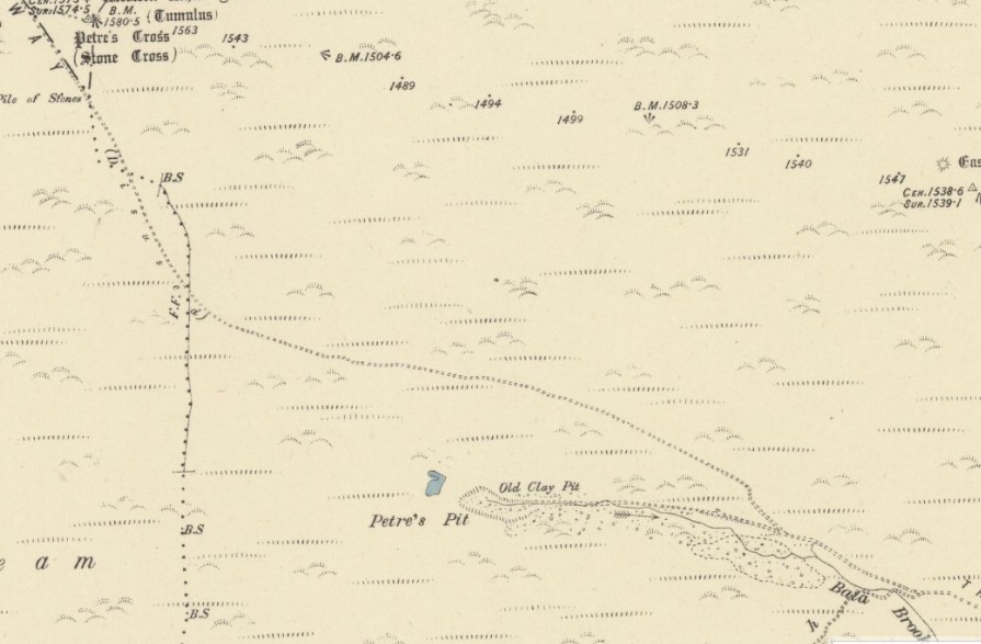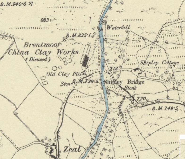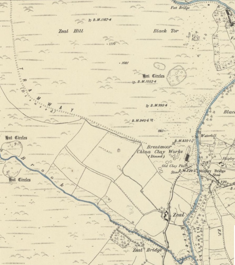 ‘This track is really an old tramroad, over which peat was once conveyed to some naphtha works at Shipley, on the verge of Brent Moor. It has been disused for a very long time, but I can remember when the rails, which were of wood, bolted to blocks of granite, were to be seen in places. The buildings at Shipley still remain, having been put in a good state of repair by a china clay company, about the year 1872, but operations in connection with this venture did not long continue … The railway was formerly known as the Zeal Tor tram-road.” [4]