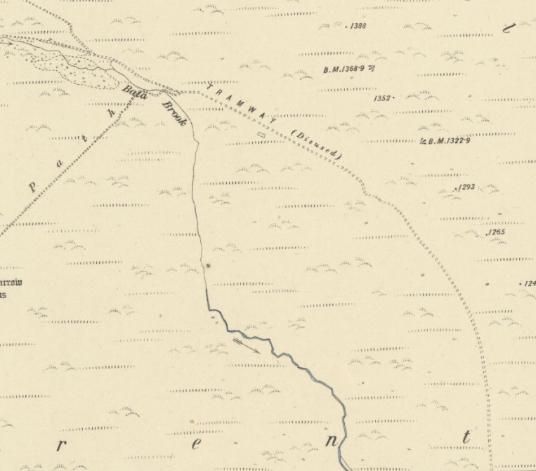 This extract again comes from the National Grid revision of the 25″ Ordnance Survey mapping of 1952, published in 1954. [9]Railmaponline.com uses a pink line to show the approximate route of the tramway. The route remains as a pathway all the way to the Red Lake workings. [13]