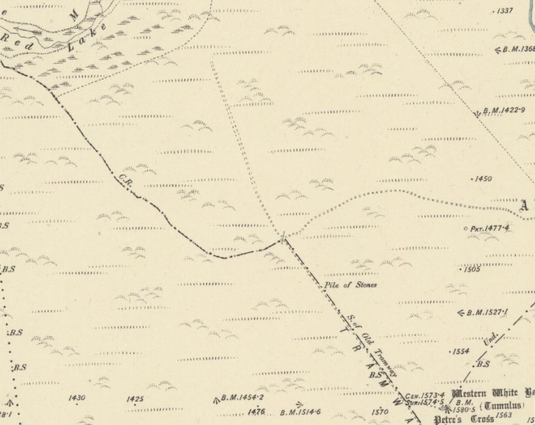 Wade tells us that the tramway leaves the workings at Left Lake “in a north-westerly direction and then passes around a long semi-circular curve on a low embankment to face due east. From this point the Redlake spoil tip comes into view for the first time, some 50 chains to the north and looking no more than a molehill in the vast expanse of moorland. However, the track, which is now at its highest point (some 1,490 feet above sea level) still has nearly a mile to travel, on a slight downhill gradient, before reaching the works. It turns to the north (7 miles 50 chains [from the head of the incline at Cantrell]) and passes a ruined building which is the remains of the six roomed Red Lake Cottage, once the home of Captain and Mrs Bray. It crosses the path of the former Zeal Tor Tramway, from Shipley Bridge, at 7 miles 57 chains. Here it enters a cutting, the deepest on the line, turns to the north-west (7 miles 77 chains) and finally emerges at Redlake. The total length of the line was some 8 miles 17 chains.” [1: p49]