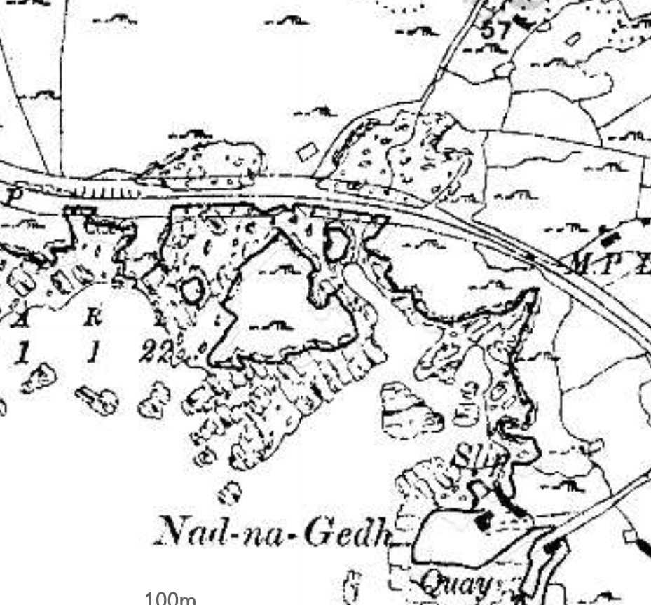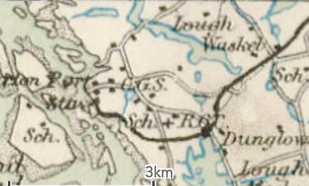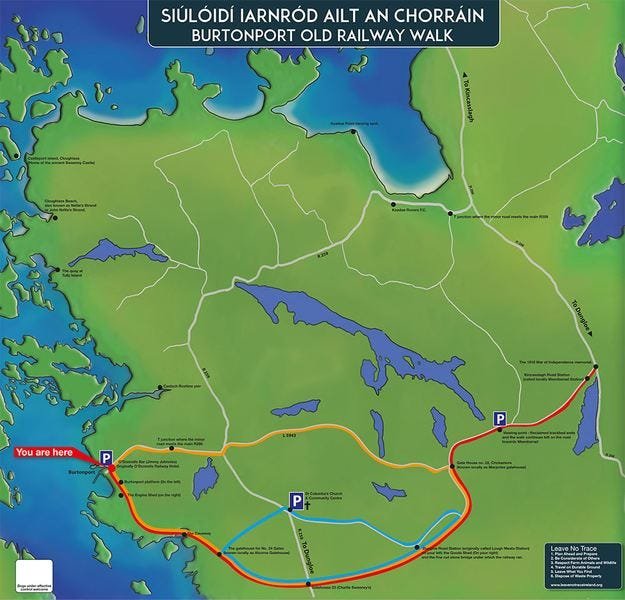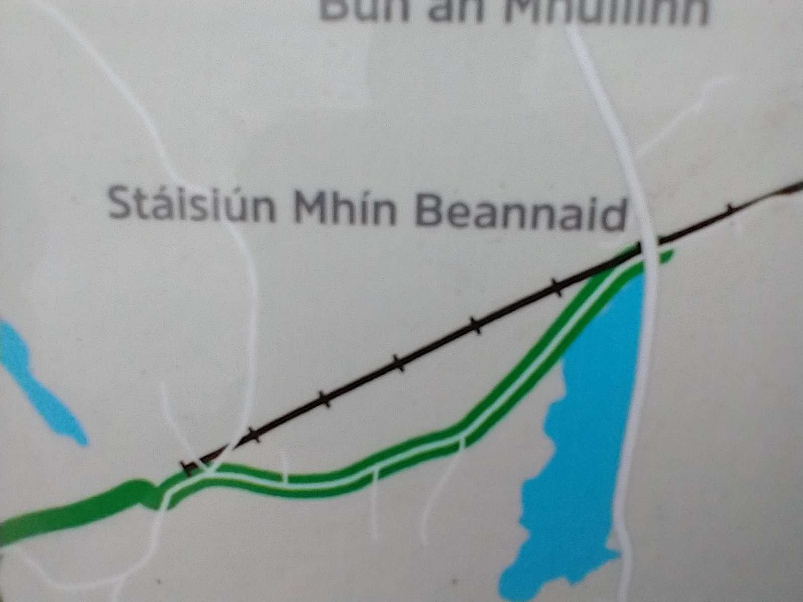 The route of the old railway between Burtonport and Kincasslagh Road Station as shown on historic mapping provided by the Ordnance Survey of Ireland dating from the early 1940s. The latter station was located to the East of Lough Waskel, to the top right of this map extract. [6]The map displayed on the information board in Burtonport shows the length of the old railway covered in this first article. [My photograph, 23rd April 2023]