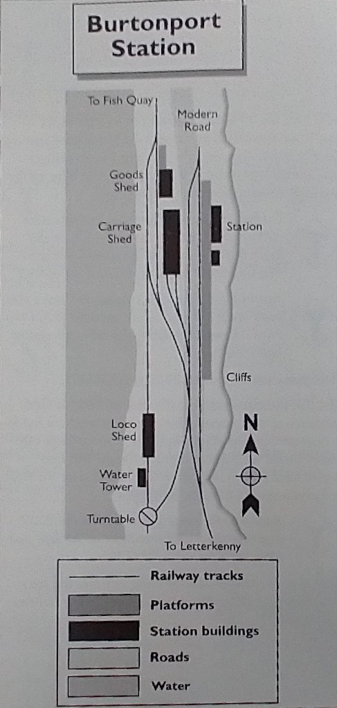 They go on to describe the station as they found it on their visit: “In the middle distance is the terminus station itself with a length of platform still in existence on the right-hand side of the road. The station house and offices still stand but are now derelict. They and the [engine] shed are now the only railway structures left at Burtonport. … Originally a siding ran along the quayside so that fish vans could be loaded directly from the fishing boats. Burtonport is still an important centre for Ireland’s fishing industry but today refrigerated articulated lorries haul the catches to their markets. It’s also from here that the ferry service runs to Aran Island, known as Arainn Mhór, Big Aran.” [2: p84]