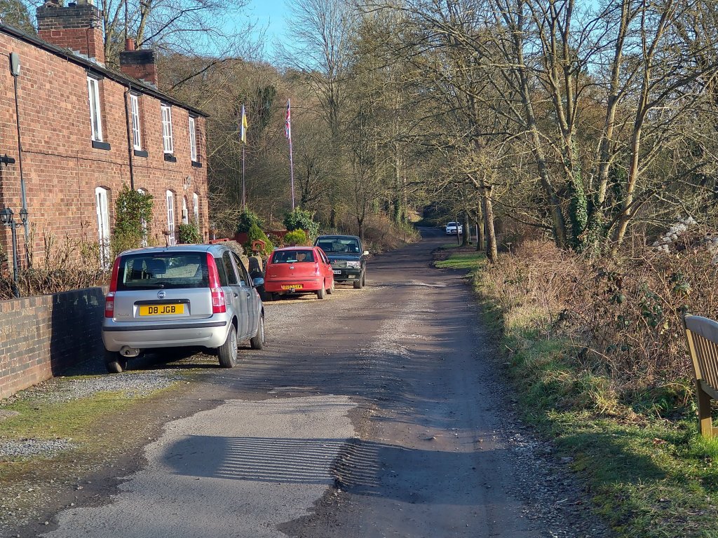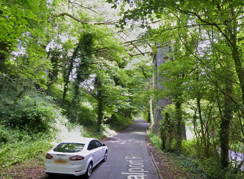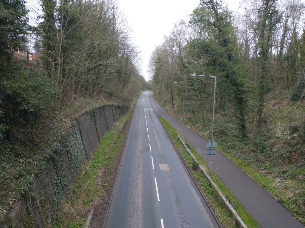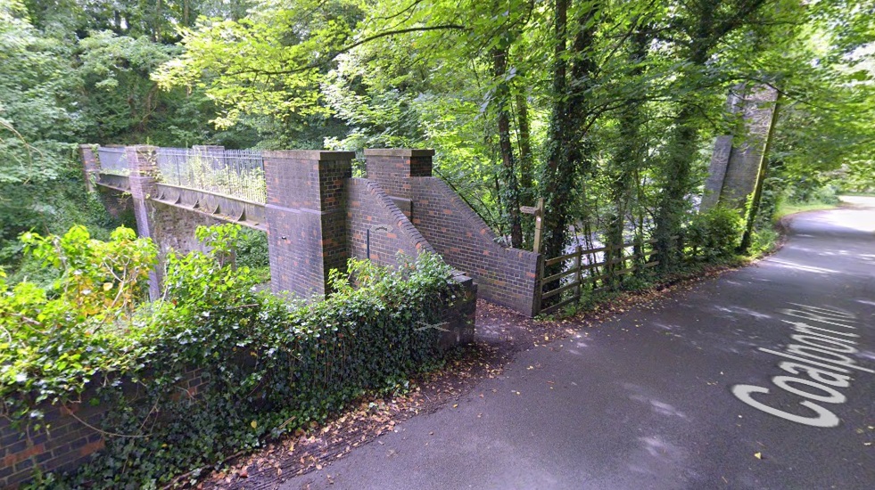 The two bridges crossing the valley can be seen in this image. Around 100 metres beyond the first bridge the old Coalport Road joins the modern road and the name of the road becomes Coalport Road. The road is then following its historic route and the old railway can be seen veering away to the left. The Silkin Way resumes following the old railway at that point. [Google Streetview, June 2022]