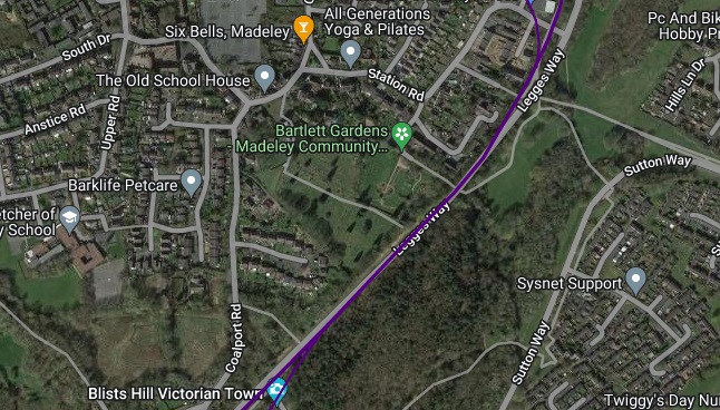This extract from the 6″ OS mapping of 1881 shows the new railways which post-dated the Canal and has the old canal routes superimposed. Note the canal incline close to Windmill Farm and the branch running to the West from ‘Aqueduct’. The aqueduct which carried this arm over the old turnpike road can be seen on the extract. It gave a name to the hamlet immediately next to it. As will be seen from the satellite image below, Madeley Court Station is long gone. The GWR Madeley Branch remains in the early 21st century as it was used for merry-go-round coal trains serving Ironbridge Power Station until the power station closed. [1][2]A Google Maps satellite image extract showing approximately the same area as the OS map extract above. Sketched onto the satellite image are: the very approximate canal routes in blue; the length of the LNWR branch which is not used by the Silkin Way in red; and the old Bridgnorth Road alignment in black. The diversion of the Silkin Way was required with the building of the A4169 and the removal of the bridge deck where the LNWR Coalport Branch line crossed the GWR Madeley Branch. There are no features on the ground in the 21st century to define the line of the old canal as it passed through the are now called Brookside. The old road bridge next to Madeley Court Railway Station remains and carries the diverted Silkin Way across what was the GWR Madeley Branch. Towards the top of this satellite image Southall Road crosses the old railway by means of the bridge shown below. [3]