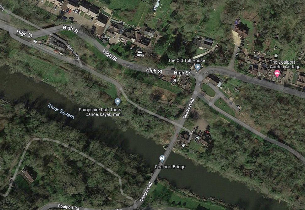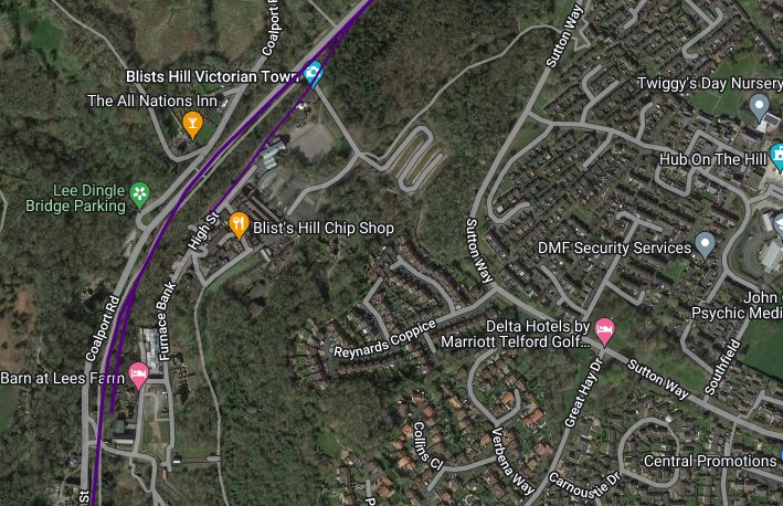 A view Northeast along Coalport Road and looking up towards the plateway bridge. [Google Streetview, June 2022]This schematic 3D map of the Blists Hill Site shows the plateway/tramway bridge bottom-centre (marked ’26’), the tunn el can be seen centre-right (marked ’56). The Silkin Way which follows the old railway curves between the two. This image looks at the site from the Northwest. [18]