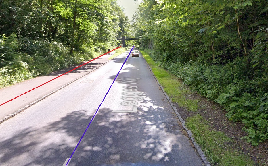 This second side-by-side image shows the next mapped length of the old canal as it reaches the head on the incline adjacent to Windmill Farm. Once again, very little of the old topography remains and the area has seen significant housing development. [11]Looking East on one of the arms of Bishopdale with the approximate line of the old canal shown in blue. [Google Streetview, June 2022]Looking North on Bishopdale with the approximate line of the old canal shown by the blue line. [Google Streetview, June 2022]Looking to the East along the most southerly part of Brookside Avenue with the old canal route marked by the blue line. As the side-by-side image above shows, we are now a good distance down the Windmill Inclined Plane and it is impossible to be sure of the relative levels of the old canal incline and the modern road.