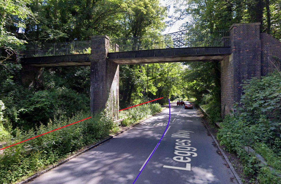 We saw these two bridges in a Google Streetview image above. The tunnel appears on the second 25″ map extract below, the two bridges on the first.