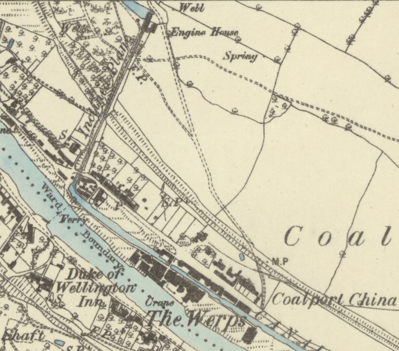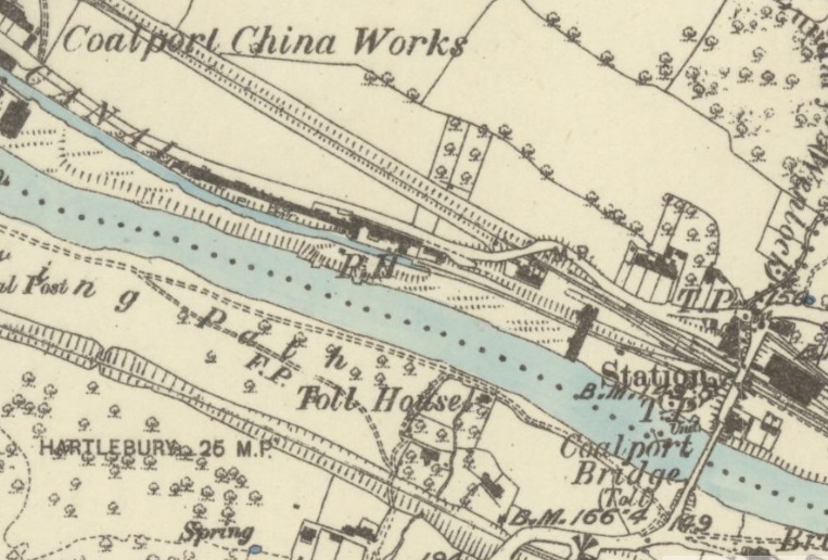 The top of the Hay Inclined Plane seen from the Southwest. The canal which saw tub boats brought to the top of the incline is immediately behind the visible brickwork on the left side of the image. The engine house was to the right. Its chimney is visible, top-right. [My photograph, 8th April 2022]A panoramic view of the engine house at the top of the Hay Inclined Plane. [My photograph, 8th April 2023]The view South down the Hay Incline towards the River Severn. The rails, chairs and sleepers are the product of a 20th century restoration and not original to the incline. [My photograph, 8th April 2022]The bridge carrying the incline over what was the LNWR Coalport Branch. This picture is taken looking East along the line of the old railway which became the footpath and cycleway named The Silkin Way after Lewis Silkin, the Minister responsible for the post-war Labour Government’s New Towns Act, 1946. Dawley New Town was designated in 1963 but expanded and renamed Telford in 1968. The Town Park to Coalport section of the route was opened by Prime Minister, Jim Callaghan, in 1977. [33][My photograph, 29th March 2023]The plaque placed on the bridge with the opening of the Silkin Way. [My photograph, 29th March 2023]The bridge carry Coalport High Street over the Hay Incline. [My photograph, 17th February 2023]A panoramic photograph which shows the sharp bend in the canal at the bottom of the incline. From this point East, the Canal ran parallel to the River Severn and wharves allowed the loading and unloading of tub boats and vessels on the River Severn. [My photograph, 17th February 2023]The reamining length of the canal is illustrated on this extract from the 6″ Ordnance Survey of 1881/1882, published in 1883. By the time of this map, as we have already noted, the LNWR Coalport Branch ha effectively superseded the canal. Of note are the factories either side of the canal which formed Coalport China Works, the end on connection between the canal and one of the sidings at Coalport Station, and the presence of the GWR Severn Valley line on the South bank of the River Servern. [32] This Google Maps extract shows the base on the Hay Inclined Plane and the truncated length of the canal alongside the River Severn. The Silkin Way marks the line of the old LNWR Coalport Branch. [Google Maps, 3rd April 2023]Coalport China Museum and Youth Hostel in 2016, looking Southeast along the last section of the canal. Both sets of buildings were once Chins Factories. The Youth Hostel is on the left, the Museum on the right, (c) Adrian Snood and used here under a Creative Commons Licence (CC BY-NC 2.0) [30]From a location further to the Southeast, looking back Northwest towards the Hay Incline, (c) Diamond Geezer and used here under a Creative Commons Licence (CC BY-NC-ND 2.0). [31]